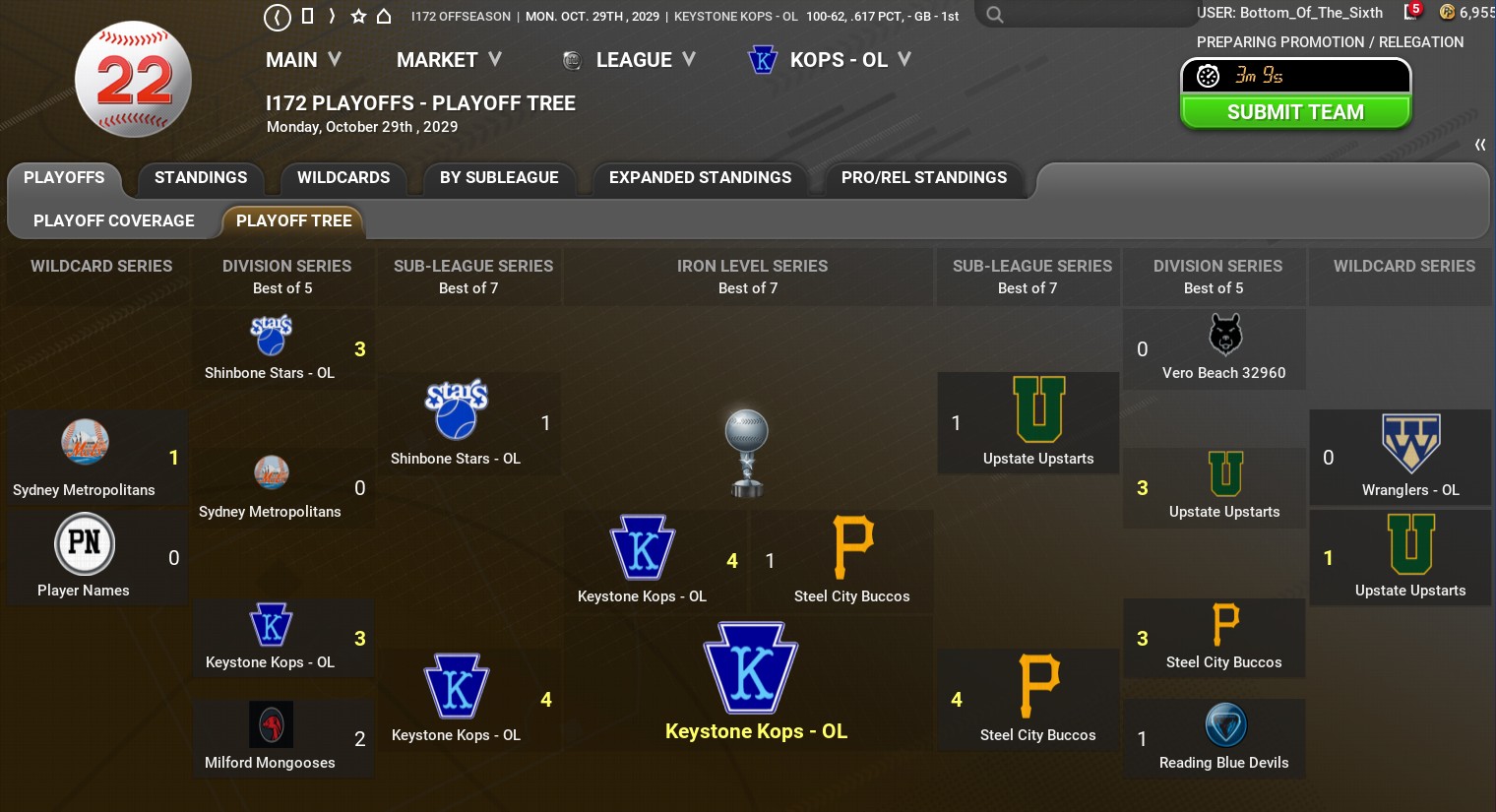 Well, diamond league setup for OL is about as "perfect" as we could expect. Three teams in the AC, two in the NC. Both teams in the NC (Nowhere Men and Annandale) have cross-league series (vs. Cary and Lemp Ave. respectively) so all five teams should qualify for OL champion this season. It should be an interesting mostly FTP league this season since BFF and OL are sharing the same placement. Gentlemen, start your engines!