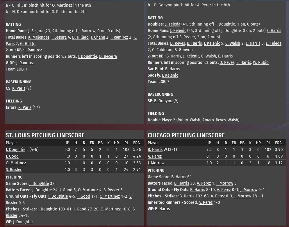 Daylen Reyes connected on a two-out, two-run single off St. Louis reliever John Good in the bottom of the eighth inning to help lift Chicago a 5-4 win at Wrigley Field (1938). The win gave the G-Men a sweep of the three-game series. George Phelps and Brian Gonyon got things going for the G-Men in the bottom of the eighth when they opened the inning with a walk and single, respectively. Good retired the next two hitters, although the base runners did move to second and third. Reyes then lined a 3-2 pitch from Good into left field to plate them both and put his team in front. A three-run top of the third for St. Louis against G-Men starting pitcher Jon Borland put the River Walkers up 3-1. Jose Ramirez led off the sixth with a homer, as St. Louis took a 4-2 advantage. Borland pitched six innings, allowing four runs on seven hits. He struck out seven and did not issue a walk. Michael Steinberg (4-2) worked two innings of scoreless relief and earned the win. Jeremy Bouchard earned his 22nd save with a scoreless ninth. Last edited by rink23; 06-11-2021 at 04:43 AM. |