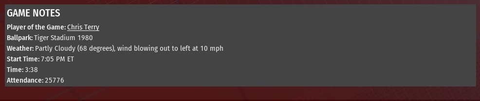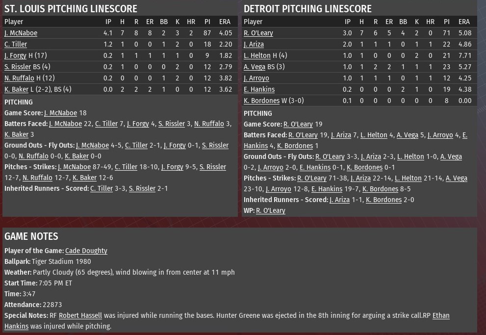 Kevin Baker took the mound in the bottom of the ninth inning for St. Louis with a 10-9 lead, three batters later Detroit had itself an 11-10 win at Tiger Stadium (1980). Dan Hillard had put the River Walkers ahead 10-9 with a one-out homer in the top of the eighth inning off Diesels relief pitcher Juan Arroyo. But when it got to the bottom of the ninth, Detroit blasted Baker to win for the third time in the four-game series. Tyler Carter opened the bottom of the ninth with a walk. Shinya Mori tied it with a double to right-center. Cade Doughty then won it, driving in two, with a double to virtually the same spot. St. Louis scored four times in the third inning and two more in the fourth to take a 7-1 lead. The Diesels wiped that out and grabbed the advantage when it pummeled St. Louis starter Jesse McNaboe for seven runs in the bottom of the fifth. Juan Herrera drove in two runs with a double. Bill Pena followed with a two-run homer. After McNaboe made his exit, Cory Tiller took over and proceeded to walk in a run. He then surrendered a two-out single to Cade Doughty. It took seven pitchers to secure the win for Detroit. Ray O'Leary handled the first three innings, giving up six runs on seven hits. Jorge Ariza took care of the fourth and fifth, giving up one run. After that, it was an inning apiece from Luis G. Helton, Ariel Vega and Arroyo. Ethan Hankins got the first two outs of the ninth. He had to leave the game with an undisclosed injury. Kleiber Bordones (3-0) got the final out of the ninth, and with it the win. |