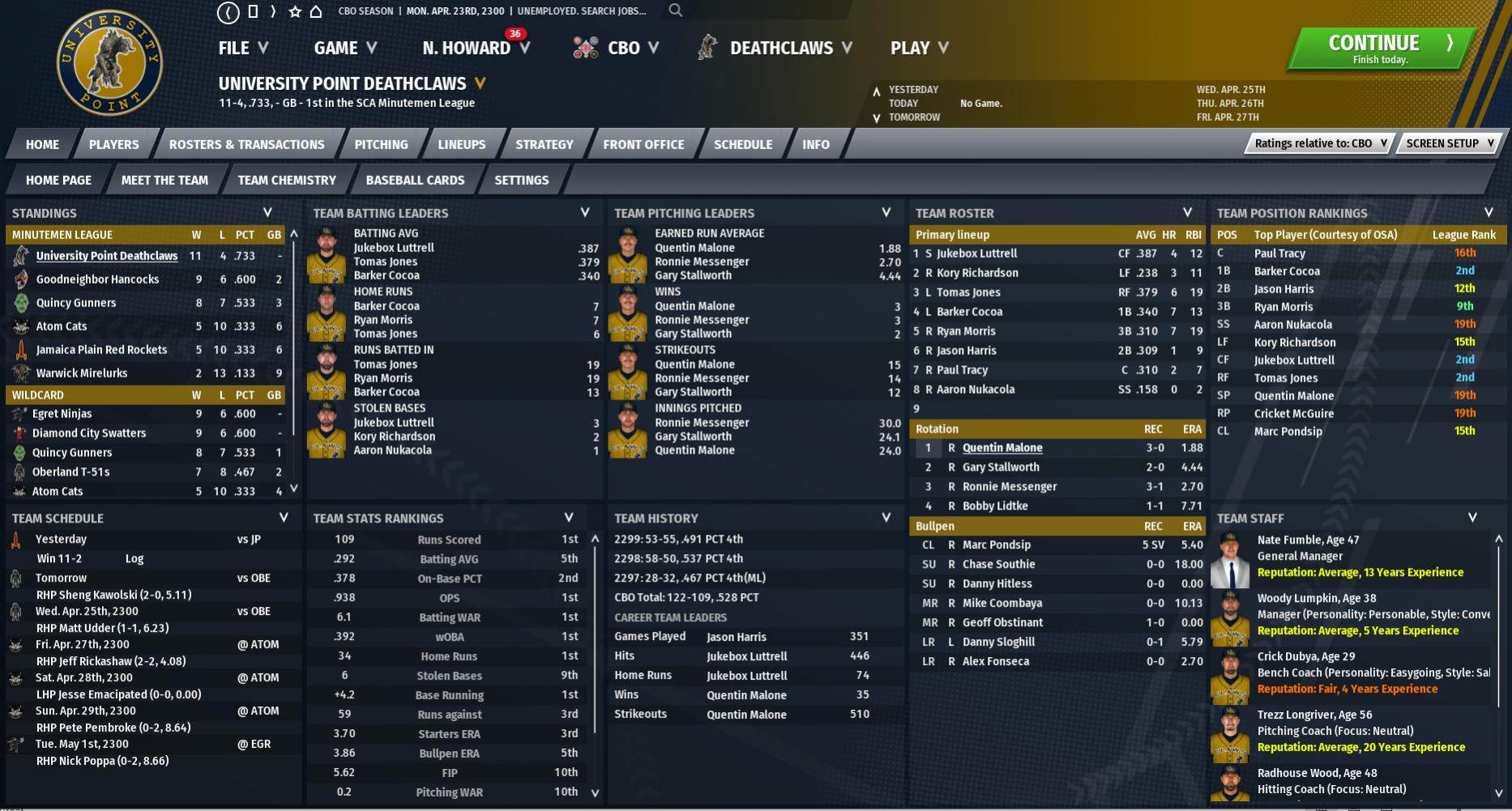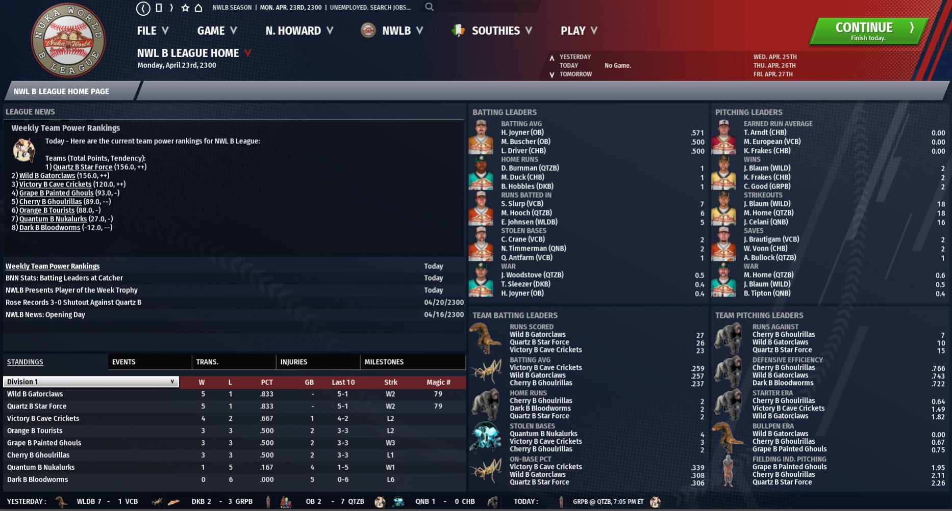 Warwick (2-13) may be the biggest surprise since they were contenders in recent seasons. They seem to have taken a few ratings hits (1B Straight QuaLiTy, for example) this offseason, but I do expect them to turn around their season to at least play close to .500 ball the rest of the way. They also have one of the better pitchers in Dave Kovalenko, but he is 0-3, 7.59 to start the season. The team is allowing over seven runs a game right now while scoring fewer than three.