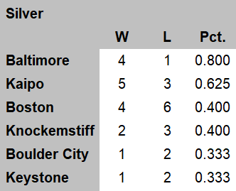 Cary still on top of the standings, with Waffletown and Shinbone a close 2-3. Overall, everyone is struggling as no OL teams are above .500 after the first couple months of play. |