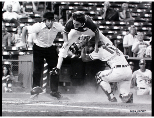 ]Before his professionally career Steve Macko was a Baylor Bear. A hard nosed middle infielder made up for in hustle what he lacked in size and athleticism. Here he is executing a wildly successful maneuver over a Miami of Ohio catcher. The Bears would advance to the 1977 College World Series.