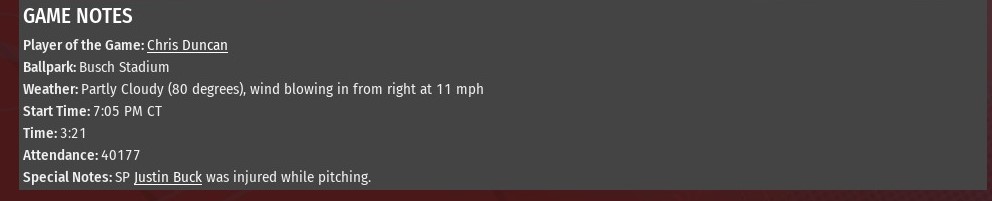 Xavier Wigfall pitched into deep in the eighth inning and Josh Forgy handled the final four outs as St. Louis completed a three-game sweep of Milwaukee with a 1-0 win at Busch Stadium (2006). Wigfall (5-5) allowed just three singles over the first 7.2 innings. He struck out five and walked two. The right-hander exited after walking pinch-hitter Jim Sukut with two outs in the bottom of the eighth inning. Josh Forgy took over and retired all four of the batters he faced for his third save. The game's lone run came in the bottom of the first. Freudis Nova led off with a single off Crushers starting pitcher George McCardel. A bunt by Eric Peretz moved Nova to second. Jose Segura flew out for the second out, before Nick Shaw was hit by a pitch. Jose Ramirez then collected the only RBI of the game with a double. Last edited by rink23; 07-14-2021 at 04:00 AM. |