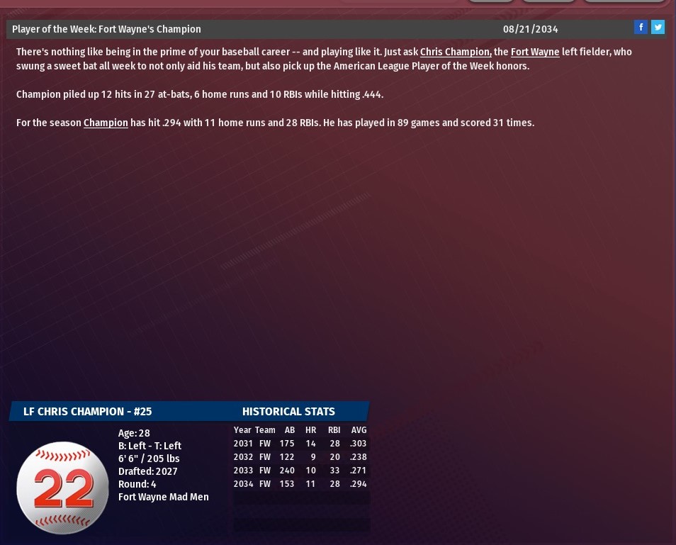 Melendez, 34, has not played this season. He least appeared in the majors with the Walkers during the 2033 season, during which he hit .214 with seven homers and 19 RBIs. Melendez also spent the 2031 season in St. Louis an the 2032 campaign with AAA Memphis. Veteran catcher Bobby Wescott was released to make room for Melendez. Wescott, 32, was signed by St. Louis in July and was moved to the major league roster when Will Banfield was traded just before the trade deadline. Wescott got into seven games for the Walkers, all of them starts. He batted .120 with no homers or RBIs. St. Louis went 1-6 in the six games he started behind the plate. |