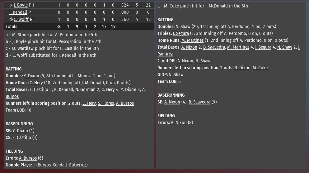 * SP -- Jesse McNaboe -- It's the first All-Star appearance for the 26-year-old right-hander. During 2035, he's gone 9-2 in 18 starts with a 3.19 ERA. * 1B -- Nick Shaw -- The National League's leading vote-getter. The 26-year-old Shaw will be a first-time starter. This season, he is hitting .339 with 16 homers and 61 RBIs in 81 games. * 3B -- Bob Saavedra -- The rookie first baseman has batted .352 with 10 homers and 50 RBIs in 86 games. Last edited by rink23; 09-12-2021 at 05:37 AM. |