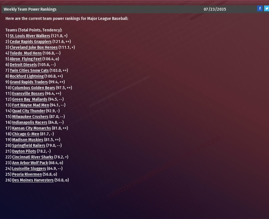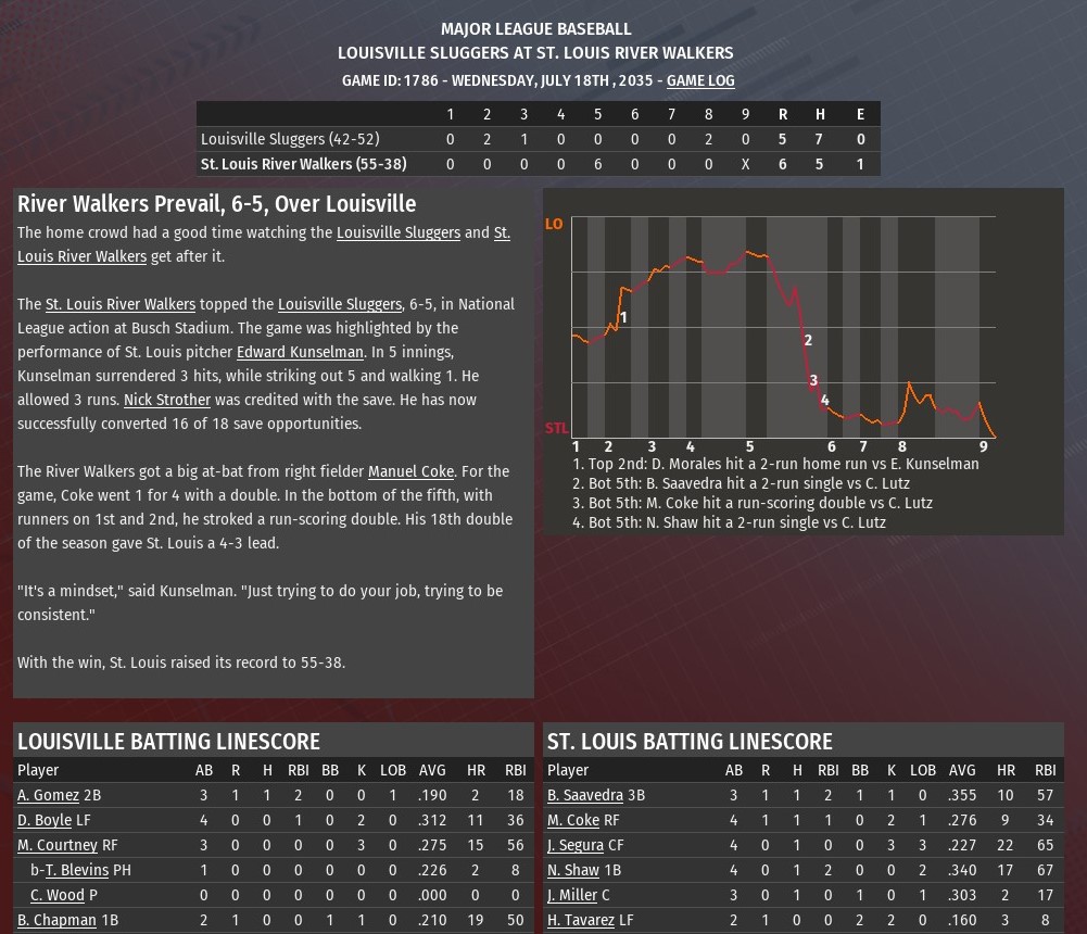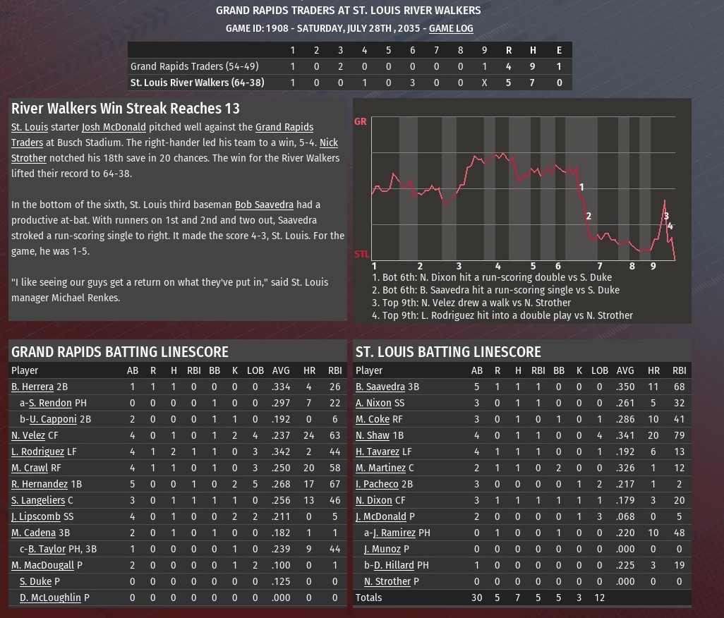 It's an even dozen on for the St. Louis River Walkers, who rallied for a 5-4 win over Grand Rapids to post a franchise-record 13th consecutive win coming out of the All-Star break at Busch Stadium (2006). The Traders tallied a pair of runs off St. Louis starting pitcher Josh McDonald in the top of the third inning, to go up 3-1. St. Louis cut he deficit tp a run in the fourth on rookie Hector Tavarez's sixth home run of the season. It came off Grand Rapids starting pitcher Mark MacDougall. The Walkers stormed into the lead in the bottom of the sixth. MacDougall started the inning, but left after a one-out walk to Martinez. Shane Duke took over but after retiring Izaac Pacheco, he allowed five consecutive batters to reach base. Included in that were, an RBI double by Nathaniel Dixon and run-scoring singles by Bob Saavedra and Aaron Nixon. The Traders did make it interesting in the ninth, loading the bases and scoring a run against St. Louis closer Nick Strother. But Strother got Leonardo Rodriguez to hit into a double play, which scored Arturo Verdogo. Then after an intentional walk to Matt Crawl, again loading the bases, Strother struck out Roberto Hernandez for his 17th save. McDonald (10-7) went the first six innings allowing three runs on eight hits. He struck out five and walked three. Juan Munoz held Grand Rapids scoreless in the seventh and eighth. Last edited by rink23; 09-15-2021 at 03:41 AM. |