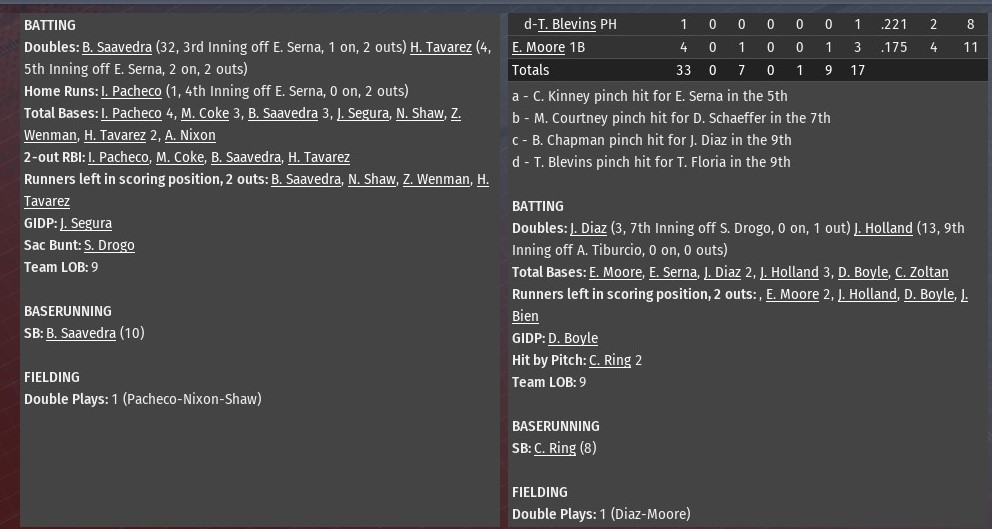 Tied 2-2, St. Louis exploded for seven runs in the top of the ninth inning, and the River Walkers went on to defeat Louisville 9-2 at Dodger Stadium. Sluggers relief pitcher Matt Whitmore struck out Nick Shaw to open the ninth inning, but immediately got into trouble allowing a single to Hector Tavarez and an RBI double to Jackson Miller. Miller had to leave the game with a back injury, being replaced by Nathaniel Dixon. The Walkers followed that by putting their next four batters on base, before Whitmore headed to the shower. The big hits were an RBI single Aaron Nixon and a three-run double by Bob Saavedra. John Fiefield took over over the Sluggers, but the Walkers kept on scoring. Manuel Coke connected on an RBI single. Shaw later drove in the inning's final run with a fly ball. St. Louis starting pitcher Jim Martin went 7.1 innings, allowing two runs on five hits. He struck out five and walked three. Greg Sones got Martin out of an eighth inning jam, retiring the only batters he faced. With a comfortable lead, Angel Tiburcio pitched a scoreless ninth. |