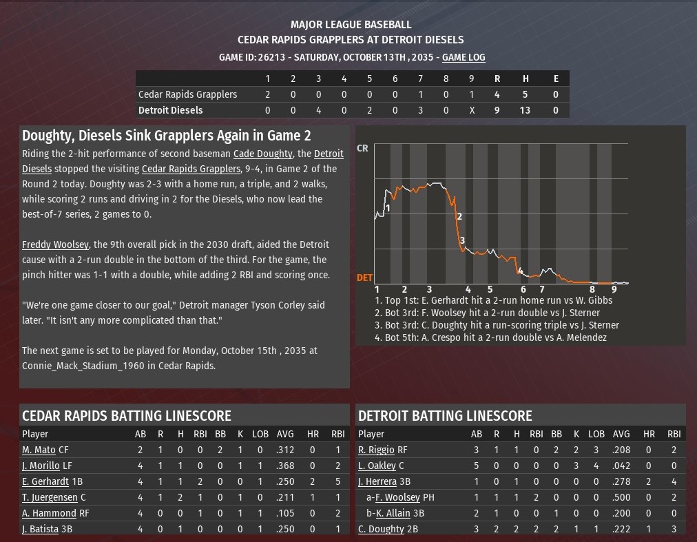 Notes Detroit advanced with a 3-1 win over Cleveland in the ALCS. Cedar Rapids advanced with a 3-1 win over Twin Cities in the ALCS Cedar Rapids won the season series 3-1 June 21 -- at Detroit Cedar Rapids 3, Detroit 1 W - J. Goshe (2-1). L - N. Wilson (2-1). Sv. - K. Kirby 12. HR - none. June 22 -- at Detroit Cedar Rapids 6, Detroit 4 W - L. Mascorro (2-1). L - N. Quito (1-3). Sv. - K. Kirby 13. HR - none. June 23 -- at Detroit Detroit 9, Cedar Rapids 7 W - J. Ariza (3-2). L - A. Echevaria (4-1). Sv. - P. Maldonaldo 4. HR - CR: S. Williams 5, R. Hinds 5, J. Miller 3, J. Batista 12. Det: F. Woolsey 2. June 24 -- at Detroit Cedar Rapids 5, Detroit 2 W - J. Glenn (8-5). L - W. Gibbs (4-4). Sv. - O. Benitez (1). HR - CR: D. Henderson 13, R. Hinds 6. Postseason history Cedar Rapids has made the playoffs twice (2021 and 2035). This is the Grapplers first World Series. Detroit has made the playoffs three times (2024, 2026 and 2035). The Diesels won the World Series (2024 and 2026). |