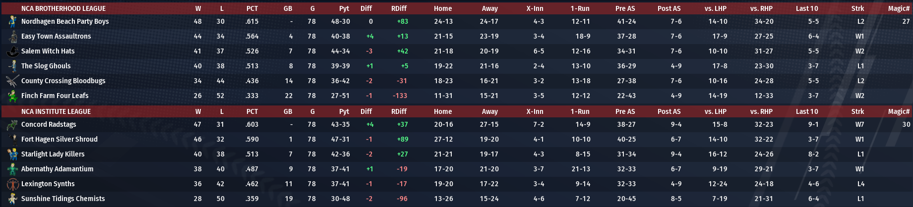 Fort Hagen may actually be the best team, but they don't win as many games as they should. Perhaps a slight spoiler since I simmed ahead to the next week, but Nordhagen Beach and the Shroud "should" be tied for the best record in the CBO right now, according to PAM. Goodneighbor and Vault 81 "should" be tied for the next best record, three games back of the Boys and Shroud.