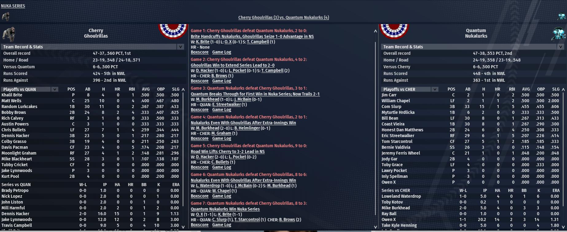 Nuka News Update All the news you need about Bradberton and Nuka World by Evan Guy 4 August 2300 Nukaworld Drowned in Quantum It's a Quantum day, and Quantum Nukalurks and Quantum Nukalurks B president Lizzie Wyath is celebrating in style. "Quantum and vodka," she slurred. "I don't plan to wake up until Wednesday." The A team overcame a 3-2 deficit against the Cherry Ghoulrillas to take the series four games to three in the second ever Nuka Series. 3B Com Slurp, traded to the Nukalurks in the winter from the Warwick Mirelurks, lurked in the starpen all series, capturing the MVP. Slurp was 15 for 33 (.455) with a homer and five RBI. RP Mike Burkhead won games 3 and 4 and followed that up with a save in Game 6. To top it off, the B squad took it to the Wild B Gatorclaws, four games to two to capture the Nuka B Series. RF Godzilla Oddball was named the MVP of the series after going 10 for 20 (.500) with an RBI. Teammate CF Kell Leek may have been the true MVP, going 7 for 23 (.304) with a home run and nine RBI. SP Greenhouse Caceres went 2-0, winning games 3 and 6 to lead his team to victory.