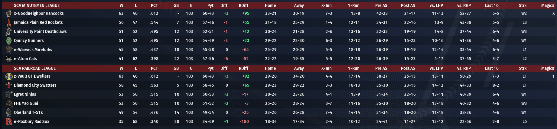 BNN Weekly Report This Week in the CBO, BMU, and BYDL by Nat Wright-Kawolski 1 September 2300 NCA Easy Town and Nordhagen Beach both fell in their bid for the Brotherhood League crown, while Fort Hagen made it official as Institute League champions with a 9-4 victory over Starlight. For the Assaultrons and Party Boys, it all comes down to the final game. A Nordhagen Beach win or Easy Town loss gives the league championship to the Boys because of a 7-5 season advantage. SCA With Vault 81's 13-5 thrashing of Roxbury, and Goodneighbor's 8-3 loss at Atom, the Dwellers have now clinched the #1 seed in the playoffs. Diamond City lost, while Jamaica Plain won, meaning the #3 seed is still up for grabs for the right to play the Hancocks. In the battle for the #5 seed, both University Point and FHE clinched their series, meaning that those two teams go into the final game tied with a 55-52 record.