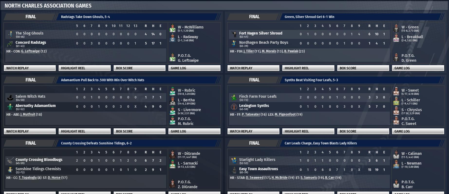 BNN Weekly Report This Week in the CBO, BMU, and BYDL by Nat Wright-Kawolski 27 August 2300 News from Around the Leagues 21 August Headlines - Egret's Poppa Blanks Quincy 22 August Headlines - FHE's Monticello Retiring; Warwick's Van Marter Pitches Career Best; Knud Bather with 3 Jacks; ET, NB, V81 All Playoff Bound 23 August Headlines - Abernathy's Westing Suffers Setback; Shroud Earn Postseason Spot 25 August Headlines - Radstags in Playoffs for First Time 26 August Headlines - Boys' Masterson Hits in 20 Straight; Shroud's Hope Nils Chemists 27 August Headlines - Goodneighbor Claims 4th Straight ML Title Series Results NCA: Abernathy 2 at County Crossing 0 Concord 1 at Salem 1 Easy Town 2 at Lexington 0 Sunshine Tidings 0 at Finch Farm 2 Nordhagen Beach 1 at Fort Hagen 1 The Slog 1 at Starlight 1 Concord 2 at Abernathy 1 County Crossing 0 at Nordhagen Beach 3 Easy Town 1 at Salem 2 The Slog 3 at Finch Farm 0 Fort Hagen 3 at Sunshine Tidings 0 Lexington 1 at Starlight 2 SCA: Atom 0 at Vault 81 2 Diamond City 2 at University Point 0 Quincy 0 at Egret 2 Jamaica Plain 2 at FHE 0 Oberland 1 at Goodneighbor 1 Roxbury 0 at Warwick 2 Atom 1 at Goodneighbor 2 Oberland 1 at Diamond City 2 Vault 81 2 at Egret 1 FHE 3 at Roxbury 0 Jamaica Plain 0 at University Point 3 Quincy 2 at Warwick 1 Featured Series: Tue 21 August - Nordhagen Beach 5 at Fort Hagen 2, 10 inn. The Nordhagen Beach Party Boys defeated the Fort Hagen Silver Shroud, 5-2, in North Charles Association action at Hubris Comics Park. Nordhagen Beach pitcher Julian Shed had a standout performance. The win belongs to Matt Breakball in relief. His record improves to 2-4. Mike Cartrette took the loss for Fort Hagen. Nordhagen Beach has now won 3 in a row. Maxx Murtagh, the Nordhagen Beach left fielder, contributed a 2-run triple in the top of the tenth inning to make the score 4-2, Party Boys. For the game, Murtagh went 1 for 5 with a triple. He drove in 2 runs and scored once. "Games like this one keep the chem makers in business," quipped Fort Hagen manager Mark Andersen. Wed 22 August - Nordhagen Beach 1 at Fort Hagen 2, 11 inn. The Fort Hagen Silver Shroud eked out a 2-1 win versus the Nordhagen Beach Party Boys at Hubris Comics Park. Nobody did more than pitcher Derek Green. He was terrific. The win boosted Fort Hagen to 59-41. The Silver Shroud relied on catcher Bixton Moore for the game-winning hit. And, in the bottom of the 11th, he delivered, hitting a run-scoring single to seal the deal. "The game of baseball will test you," said Mark Andersen, the Fort Hagen skipper. "This one tested us." Players of the Week NCA: RF Crooked Tostado, Lexington, 12/21, 2 HR, 7 RBI SCA: RF Tomas Jones, University Point, 10/19, 2 HR, 8 RBI, 4 R CA: 1B Joe Provisioner, Outpost Zimonja, 7/17, 3 HR, 9 RBI MA: RF Gunner Eyesocket, Haymarket Mall, 9/19, 4 HR, 10 RBI, 6 R Transactions Monday, August 27th, 2300 Abernathy Adamantium: Placed SP Brad Westing on the 7-day injured list, retroactive to 08/18/2300. Concord Radstags: Placed SS Sean Koester on the 7-day injured list, retroactive to 08/26/2300. Sunday, August 26th, 2300 Abernathy Adamantium: Activated SP Brad Westing from the injured list. University Point Deathclaws: Placed SP Adam Froggatt on the 7-day injured list, retroactive to 08/25/2300. The Slog Ghouls: Placed RP Jason Woods on the 60-day injured list. Friday, August 24th, 2300 Goodneighbor Hancocks: RF Zachary Utsinger returns from his rehab assignment. Easy Town Assaultrons: Placed CL Beanpole Callaway on the 60-day injured list. Thursday, August 23rd, 2300 Jamaica Plain Red Rockets: Placed RP Little Jemmy Madison on the 7-day injured list, retroactive to 08/22/2300. Sunshine Tidings Chemists: Activated RP Scaredy Cat Talbott from the 60-day injured list. Wednesday, August 22nd, 2300 Warwick Mirelurks: CL Tom Rose returns from his rehab assignment. Concord Radstags: Placed 3B Lucky Oldsun on the 7-day injured list, retroactive to 08/19/2300. Goodneighbor Hancocks: Activated SP Josh Dude from the injured list. Roxbury Rad Sox: Signed RP Run Backes. Roxbury Rad Sox: Signed RP Steve Watertank. Roxbury Rad Sox: Signed RP Joe Ritze. Tuesday, August 21st, 2300 Roxbury Rad Sox: Signed RP Greg Ziemba. Roxbury Rad Sox: Signed RP Ken Crocket. Roxbury Rad Sox: Signed RP Justin Novak. CBO Standings, Stats, and Power Rankings BMU Standings Analysis Six of the 10 teams are now set as we head into the final week of the CBO regular season. Taking inventory of the teams left to clinch a spot, Diamond City and Jamaica Plain is a win away and The Slog's magic number is two. The last remaining spot is a probable last-day decision between the Egret Ninjas and FHE Yao Guai. The Ninjas and Yao Guai are battling for the last playoff spot in the SCA with Egret traveling to FHE for the final weekend. Before that, the Ninjas make a trip to Atom (#21), while the Guai battle a tough Jamaica Plain (#10). As we head into the last week of the season, the NCA looks to be the team in power. Nordhagen Beach (#1) currently claims the top spot, doing what it has to do to claim the #1 spot in the NCA with league rival Easy Town (#3) just a game back with the 2nd-best overall record in the CBO. The Boys get a challenge early in the week in facing the Silver Shroud, before facing Finch Farm (#23) for what should be a successful weekend. The Assaultrons get a homestand, too, but they face Starlight (#15) and Salem (#13), two decent and above .500 teams angry to miss out on the playoffs. Fort Hagen (#2) is looking to be a powerhouse team again, rising up to a true challenger role while Concord (#8) would need to make up ground in their postseason debut year. While Goondeighbor (#5) and Vault 81 (#4) are tied for the SCA lead with the Hancocks holding the tiebreaker edge, the Dwellers look to be the team in control right now. Vault 81 also gets Warwick (#18) and Roxbury (#22) both at home in the final week, while the Hancocks travel to Diamond City (#7) and the Cats. Current playof
