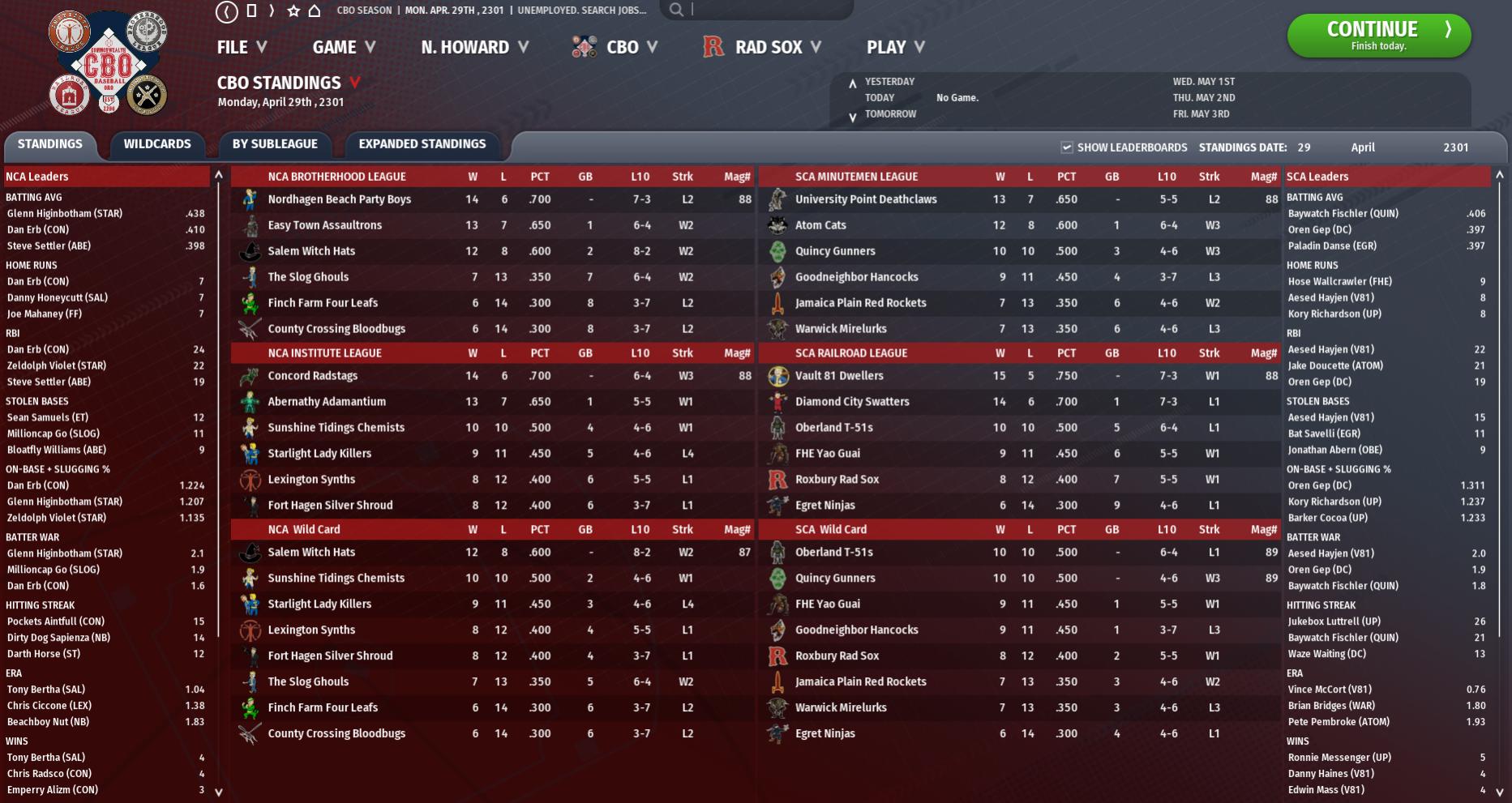 Right now, they are just one game back of the wildcard. I have already simmed ahead, so after I write this week's report, I'll add an extra feature on the Shroud's first month of the 2301 season.