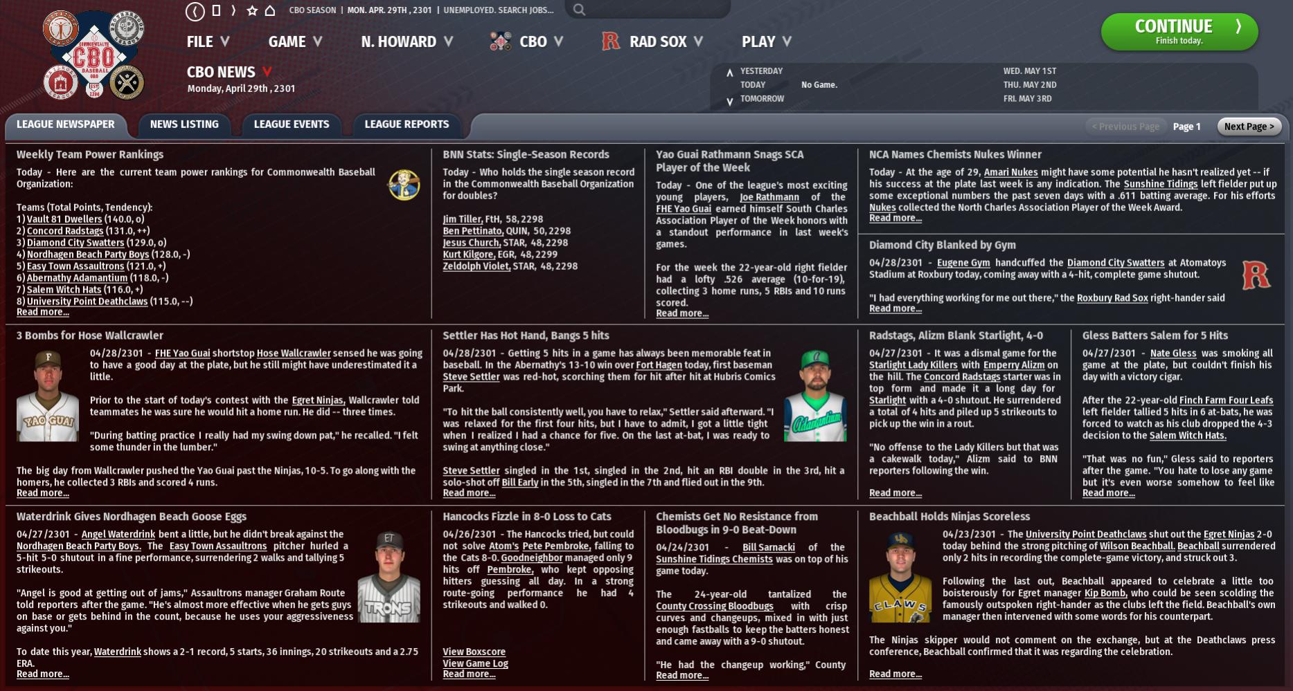 BNN Weekly Report This Week in the CBO, BMU, and GBRL by Nat Wright-Kawolski 15 April 2301 Players of the Week Violet Red-Hot, NCA Player of the Week: Zeldolph Violet has the tools to stick in this league for many years. The 24-year-old first baseman of the Starlight Lady Killers had a hot bat in the North Charles Association over the past seven days and won the Player of the Week honors. Violet batted .643 with 9 hits in 14 at-bats, 2 home runs and 9 RBIs. Great Week for Vault 81's Aesed Hayjen: Aesed Hayjen is respected by most Vault 81 Dwellers fans for his no-frills style of play. The 23-year-old center fielder went about his business with vigor last week to grab the South Charles Association Player of the Week honors. He compiled a .500 average (11-for-22) with 5 home runs, 10 RBIs and 8 runs scored. Transactions Monday, April 15th , 2301 Quincy Gunners: Placed RP Dave Arreola on the 7-day injured list, retroactive to 04/13/2301. Starlight Lady Killers: Signed SP Paul Grayer. Starlight Lady Killers: Signed RP Lucky Dim Nunez. Starlight Lady Killers: Signed RP Carl Ryall. University Point Deathclaws: Signed free agent SS Tripp Park to a minor league contract. University Point Deathclaws: Released 2B Elijah Maxx-Dickerson. Friday, April 12th , 2301 Nordhagen Beach Party Boys: Placed SP Chet Arthur on the 7-day injured list, retroactive to 04/10/2301. Nordhagen Beach Party Boys: Placed RF Jonathan Angelou on the restricted list. Sunshine Tidings Chemists: Placed SP Jason Bourque on the 7-day injured list, retroactive to 04/11/2301. Fort Hagen Silver Shroud: Placed SP Matt Hope on the restricted list. Sunshine Tidings Chemists: Signed RP Jake Caller. Nordhagen Beach Party Boys: Signed RP Steve Watertank. Thursday, April 11th , 2301 Vault 81 Dwellers: Placed RP Randy Kaplan on the 7-day injured list, retroactive to 04/10/2301. Lexington Synths: Placed SP Chris Ciccone on the 7-day injured list, retroactive to 04/10/2301. Vault 81 Dwellers: Signed CF Delk Delightful. Vault 81 Dwellers: Signed RP Right Overby. Jamaica Plain MGR Mark Sellsword angry with fourth-straight home loss, breaks bottle that slices his hand. Wednesday, April 10th , 2301 University Point Deathclaws: Activated LF Kyle Quickfingers from the injured list. Egret Ninjas: Activated 1B Casey Roux from the injured list. Roxbury Rad Sox: Released SS Tripp Park. Tuesday, April 9th , 2301 FHE Yao Guai: Activated RP Tommie Lightbulb from the restricted list. The Slog Ghouls: Placed RF Boots Yellowhair on the 7-day injured list, retroactive to 04/08/2301. Fort Hagen Silver Shroud: Placed SS Well Done Dungan on the 7-day injured list, retroactive to 04/08/2301. Standings Team Power Rankings Weekly Team Power Rankings: Here are the current team power rankings for Commonwealth Baseball Organization: Teams (Total Points, Tendency): 1) University Point Deathclaws (155.0, ++) 2) Concord Radstags (151.0, o) 3) Vault 81 Dwellers (151.0, +) 4) Abernathy Adamantium (149.0, --) 5) Easy Town Assaultrons (129.0, -) 6) Nordhagen Beach Party Boys (129.0, +) 7) Diamond City Swatters (128.0, -) 8) Goodneighbor Hancocks (112.0, -) 9) Quincy Gunners (112.0, ++) 10) Sunshine Tidings Chemists (111.0, o) 11) Atom Cats (109.0, --) 12) Starlight Lady Killers (93.0, ++) 13) Fort Hagen Silver Shroud (92.0, ++) 14) Salem Witch Hats (71.0, ++) 15) Oberland T-51s (69.0, +) 16) FHE Yao Guai (67.0, --) 17) Jamaica Plain Red Rockets (51.0, --) 18) Warwick Mirelurks (51.0, ++) 19) Lexington Synths (49.0, +) 20) Roxbury Rad Sox (49.0, -) 21) County Crossing Bloodbugs (47.0, +) 22) Finch Farm Four Leafs (46.0, --) 23) Egret Ninjas (26.0, --) 24) The Slog Ghouls (11.0, -) Analysis University Point takes over the top spot in the Power Rankings, while The Slog is at the bottom. There are not a lot of early surprises for success, but there are a few teams that seem to be better than their records indicate. At the bottom of the SCA, Egret (2-8) is one of those teams. The Ninjas have been all-around bad, so it could be early season slumps or just a bad team. Jamaica Plain (3-7) is another. They are seeing some slumps with the big surprise so far being 1B Cody Flatt (.185/1/7) who hit 35 home runs last season and 33 two seasons ago. Usually successful on the mound, SP Chris Deathclaw is 0-3 despite a 2.45 ERA. Minor League Report BMU Players of the Week Hacker Takes This Week's Trophy: It can be difficult for a young player to step out of the shadows and assert himself in the Commonwealth Association, but last week Kyle Hacker of the College Square Nerd Ragers reminded everyone just why he's here as he threw up numbers that made him an easy selection for Player of the Week. Hacker rocked opposing pitching for a .583 average (7-for-12), 3 home runs and 5 RBIs to come away with the award. Bohinski Selected Top Performer in MA: So far in his young career, Goose Bohinski has kept a low profile, but after his performance at the plate last week, he attracted the notice of the rest of the Massachusetts Association in a big way as he was named the Player of the Week today for his efforts. The 23-year-old Somerville Place Sentry Bots catcher hit at a torrid .615 clip as he collected 8 hits in 13 at-bats, 3 home runs, 7 RBIs and 6 runs scored. Standings GBRL Players of the Week North League Announces #1 Player: His hard work and hustle paid off this week. The hard-working and hard-playing Safety Langer was rewarded with the North League Player of the Week honors. The scrappy Galleria Robotics Experts left fielder hit .632 while collecting 12 hits in 19 at-bats, 2 home runs and 4 RBIs. SL's Best Player, Pooch of Neponset Park: Tylor Pooch went on a week-long tirade against the South League pitchers and was acclaimed the Player of the Week. The Neponset Park shortstop was hot as a firecracker, exploding with a .647 average, no home runs and 0 RBIs. For the week Pooch bashed out 11 hits in 17 at-bats and scored 9 runs. Standings