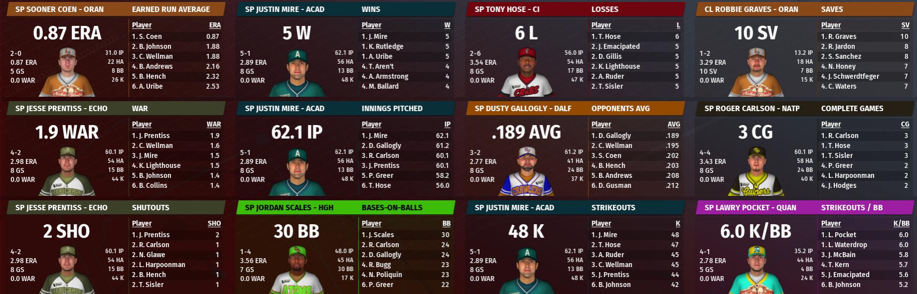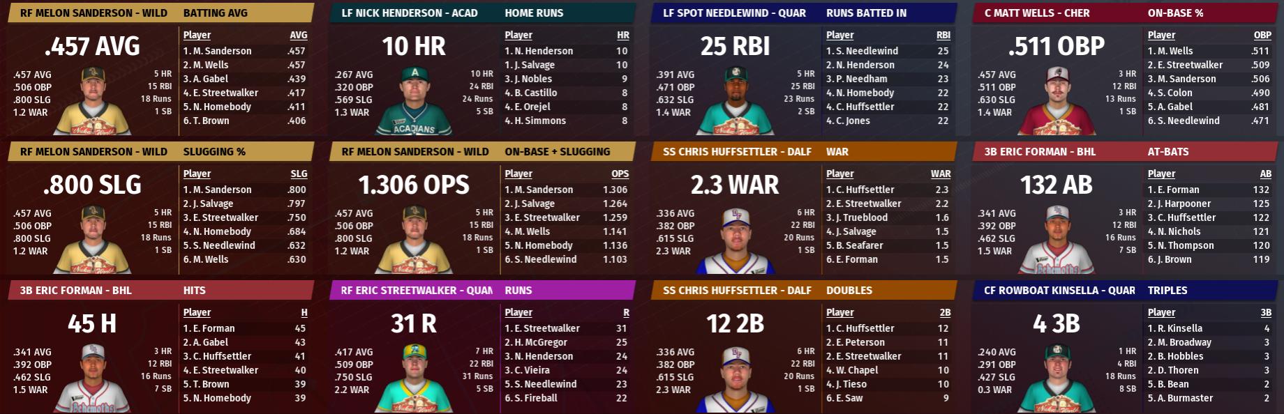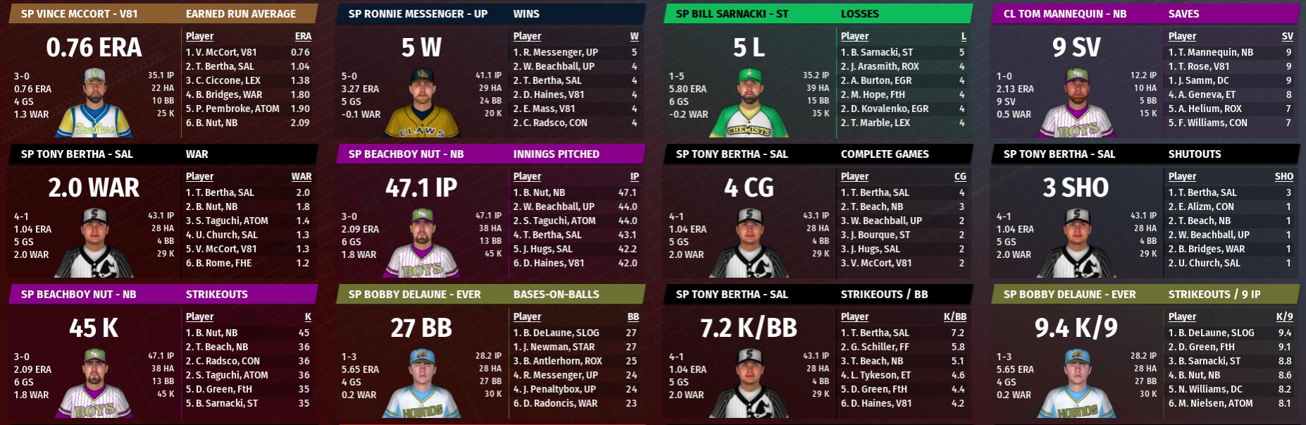 BNN Weekly Report This Week in the CBO, BMU, and GBRL by Nat Wright-Kawolski 20 May 2301 Players of the Week North Charles Association Picks Top Player: Zeldolph Violet demonstrated his potential to be a star in the game last week and today he took home the North Charles Association Player of the Week Award. The Starlight first baseman wreaked havoc on opposing pitchers last week, pounding them for a .435 average (10-for-23) with 2 home runs and 9 RBIs on his way to claiming the honor. So far this season Violet has hit .298 with 8 home runs, 32 RBIs and scored 23 times. Laughy Collects Player of the Week Award: It's always a thrill for fans of the team and students of the game alike when a superstar in the making shows what he's got. Ricky Ticky Laughy, the Oberland T-51s 23-year-old center fielder, put himself in the spotlight last week making him the clear-cut choice for South Charles Association Player of the Week honors. He ripped 8 hits in 18 at-bats, compiling a .444 average with 3 home runs and 6 RBIs. So far this season Laughy has put up a .284 batting average with 38 hits, 11 home runs and 33 RBIs. Transactions Monday, May 20th , 2301 Sunshine Tidings Chemists: Placed CF Fernando Z on the 7-day injured list, retroactive to 05/19/2301. The Slog Ghouls: Activated RF Boots Yellowhair from the injured list. FHE Yao Guai: Signed RP Austin Peterson. The Salem Witch Hats traded 22-year old minor league RHP Ichavod Shoemaker to the Sunshine Tidings Chemists, getting 30-year old minor league 1B Eddie Can in return. Sunday, May 19th , 2301 Abernathy Adamantium: Placed SP Gerald Jerry on the 7-day injured list, retroactive to 05/18/2301. Saturday, May 18th , 2301 FHE Yao Guai: Placed RP W. H. Lub on the 7-day injured list, retroactive to 05/17/2301. The Slog Ghouls: Placed 2B C.T. Woodard on the 7-day injured list, retroactive to 05/17/2301. Fort Hagen Silver Shroud: Activated SS Well Done Dungan from the injured list. Fort Hagen Silver Shroud: Sent SS Well Done Dungan to Triple A C.I.T. Ruins for injury rehab. Fort Hagen Silver Shroud: Activated RP Matt Demented from the injured list. Fort Hagen Silver Shroud: Released 3B Twin Fratelli. FHE Yao Guai: Signed RP Josh Maney. The Slog Ghouls: Signed C Keith Biography. Friday, May 17th , 2301 Nordhagen Beach Party Boys: Activated SP Chet Arthur from the injured list. Nordhagen Beach Party Boys: Sent SP Chet Arthur to Triple A Greentop Nursery for injury rehab. Thursday, May 16th , 2301 Abernathy Adamantium: RP Danny Rocketman returns from his rehab assignment. Finch Farm Four Leafs: Activated RP Zippy Patterson from the injured list. The Nordhagen Beach Party Boys traded 18-year old minor league C Bryan Coltfourty and 23-year old minor league RHP Adoptee Packwood to the Cranberry Island Hermit Crabs, getting 32-year old RHP Bill Hench in return. Wednesday, May 15th , 2301 Sunshine Tidings Chemists: RP Josh Kelley returns from his rehab assignment. Sunshine Tidings Chemists: Released 1B Chris Wager. Easy Town Assaultrons: Released C Keith Biography. Oberland T-51s: Released RP Josh Maney. Easy Town Assaultrons: Signed RP Nick Dyson. Standings Team Power Rankings Weekly Team Power Rankings: Here are the current team power rankings for Commonwealth Baseball Organization: Teams (Total Points, Tendency): 1) University Point Deathclaws (133.6, +) 2) Salem Witch Hats (128.3, +) 3) Diamond City Swatters (126.4, -) 4) Nordhagen Beach Party Boys (119.3, -) 5) Abernathy Adamantium (119.1, o) 6) Concord Radstags (114.1, o) 7) Vault 81 Dwellers (109.0, +) 8) Atom Cats (101.9, -) 9) Easy Town Assaultrons (98.7, ++) 10) Fort Hagen Silver Shroud (97.6, -) 11) Jamaica Plain Red Rockets (92.4, ++) 12) Starlight Lady Killers (90.4, -) 13) Goodneighbor Hancocks (88.4, --) 14) FHE Yao Guai (86.4, -) 15) Quincy Gunners (83.3, ++) 16) Roxbury Rad Sox (83.3, --) 17) Oberland T-51s (79.3, -) 18) County Crossing Bloodbugs (78.1, +) 19) Sunshine Tidings Chemists (67.0, +) 20) The Slog Ghouls (67.0, --) 21) Egret Ninjas (56.7, +) 22) Finch Farm Four Leafs (53.7, -) 23) Lexington Synths (46.6, o) 24) Warwick Mirelurks (39.3, o) Analysis Playoff Picture Through 30 Games NCA: 1. Salem (league record tiebreaker over Nordhagen Beach) 2. Abernathy (league record tiebreaker over Concord) 3. Nordhagen Beach 4. Concord 5. Easy Town SCA: 1. University Point 2. Diamond City 3. Vault 81 4. Atom 5. Jamaica Plain (best head-to-head record among FHE and Goodneighbor) 6. FHE (second-best head-to-head record among Jamaica Plain and Goodneighbor) 7. Goodneighbor (third-best head-to-head record among Jamiaca Plain and FHE) Minor League Report BMU Players of the Week CA Player of the Week Awarded: Harry Bush has the tools to stick in this league for many years. The 24-year-old first baseman of the Mystic Pines Raybathers had a hot bat in the Commonwealth Association over the past seven days and won the Player of the Week honors. Bush batted .455 with 5 hits in 11 at-bats, 3 home runs and 6 RBIs. So far this year, Bush is batting .333 with 4 home runs and 16 RBIs. MA's Top Player, Motley of Fiddler's Green: Chris Motley is respected by most Fiddler's Green T-60s fans for his no-frills style of play. The 25-year-old first baseman went about his business with vigor last week to grab the Massachusetts Association Player of the Week honors. He compiled a .692 average (9-for-13) with 3 home runs, 9 RBIs and 7 runs scored. So far this year in 6 games Motley is hitting .500 with 3 home runs, 9 RBIs and 8 runs scored. Standings GBRL Players of the Week Robotics Experts Noob Named NL's #1 Player: One of the league's most exciting young players, Sam Noob of the Galleria Robotics Experts earned himself North League Player of the Week honors with a standout performance in last week's games. For the week the 21-year-old right fielder had a lofty .438 average (7-for-16), collecting 3 home runs, 5 RBIs and 5 runs scored. Presently Noob is hitting .386 with 7 home runs and 14 RBIs. He has played in 11 games