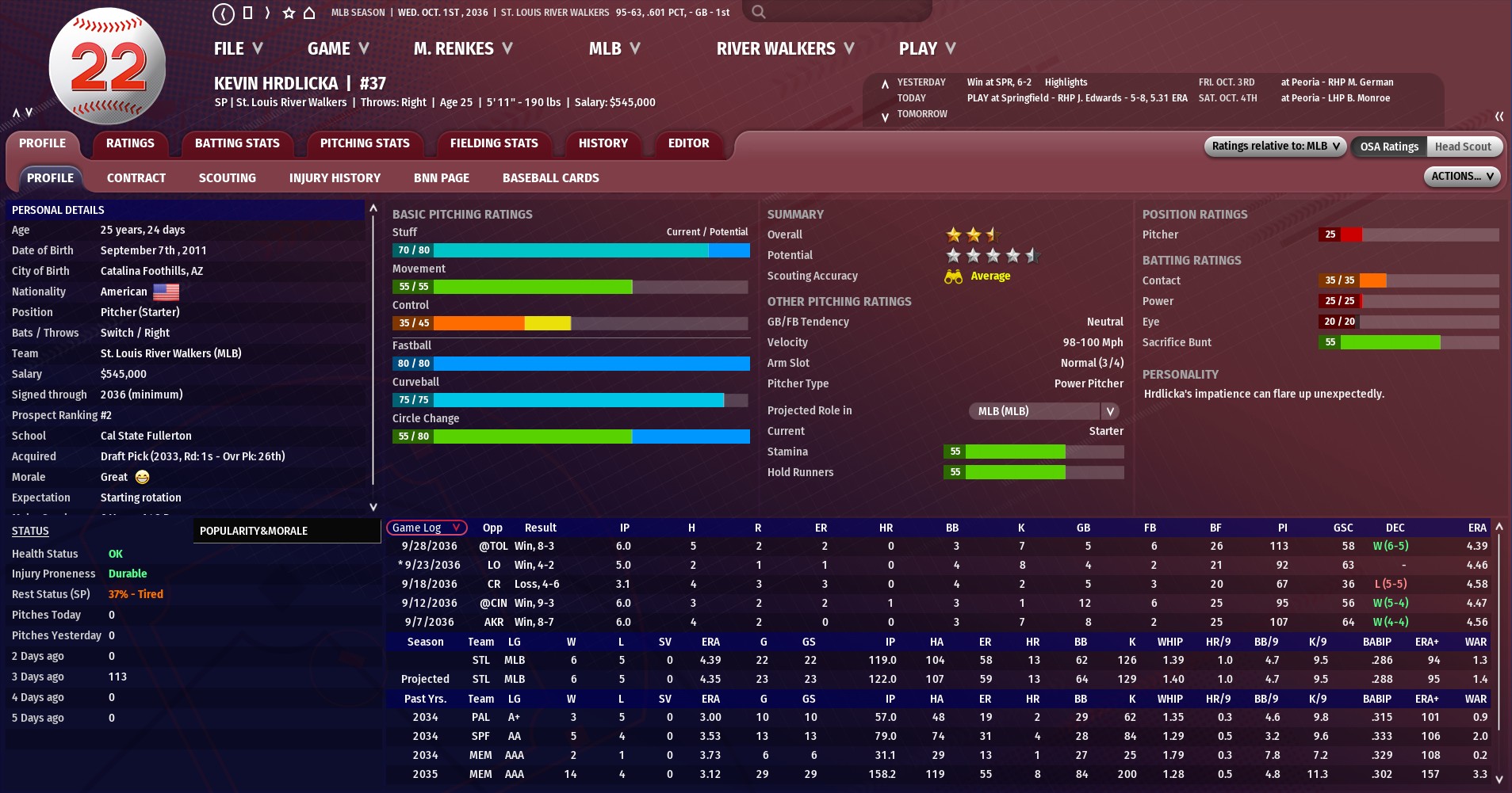 St. Louis scored eight runs over the first four innings to build an 8-0 lead, and the River Walkers breezed to a 10-4 win to complete a four-game sweep of Louisville at Busch Stadium (2006). Bob Saaverdra led off the bottom of the first inning with a single off Sluggers starting pitcher Esteban Serna, and later scored on a Nick Shaw single to put St. Louis ahead 1-0. The RBI was Shaw's 100th of the season. The Walkers then scored twice in the second and third innings before tallying a trio of runs in the fourth. A walk to Mark Herman followed by an error by Sluggers center fielder Caleb Kinney on a ball hit by Jose Segura opened the bottom of the second for St. Louis. Herman scored on a ground ball hit by Abdul-Nasser bin Am. Pitcher Josh McDonald got down a bunt to score Segura. The third featured Manuel Coke being hit by a Serna pitch to open the inning. Shaw followed with a single. Herman drove in Coke with a single. Segura collected an RBI with a fly ball to score Shaw. A two-run homer from Coke off reliever Tony Arroyo highlighted the fourth inning. The two RBIs gave Coke 100 for the season. Shaw made it a back-to-back with his 29th homer of 2036. Louisville did make it somewhat interesting with a four-run fifth against McDonald. Kinney led off the inning with a homer. The Sluggers banged out three more hits in the inning, including a two-run double by Mike Courtney. That was the end of the scoring for Louisville. St. Louis added two insurance runs in the seventh. Herman collected another RBI with a double, as did Segura with a sacrifice fly. McDonald (14-7) earned the win despite the one bad inning. He pitched six, allowing four runs on seven hits. He struck out eight and didn't issue a walk. Brennan Weldon worked two innings of scoreless relief. Chris Eason allowed Louisville to load the bases in the ninth but didn't give up a run. |