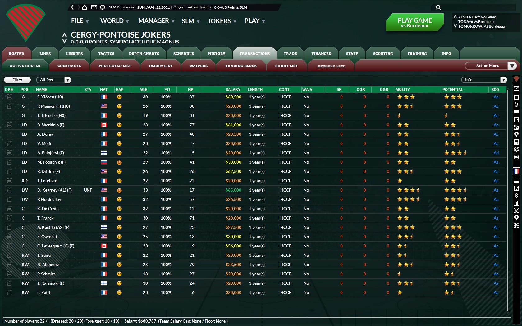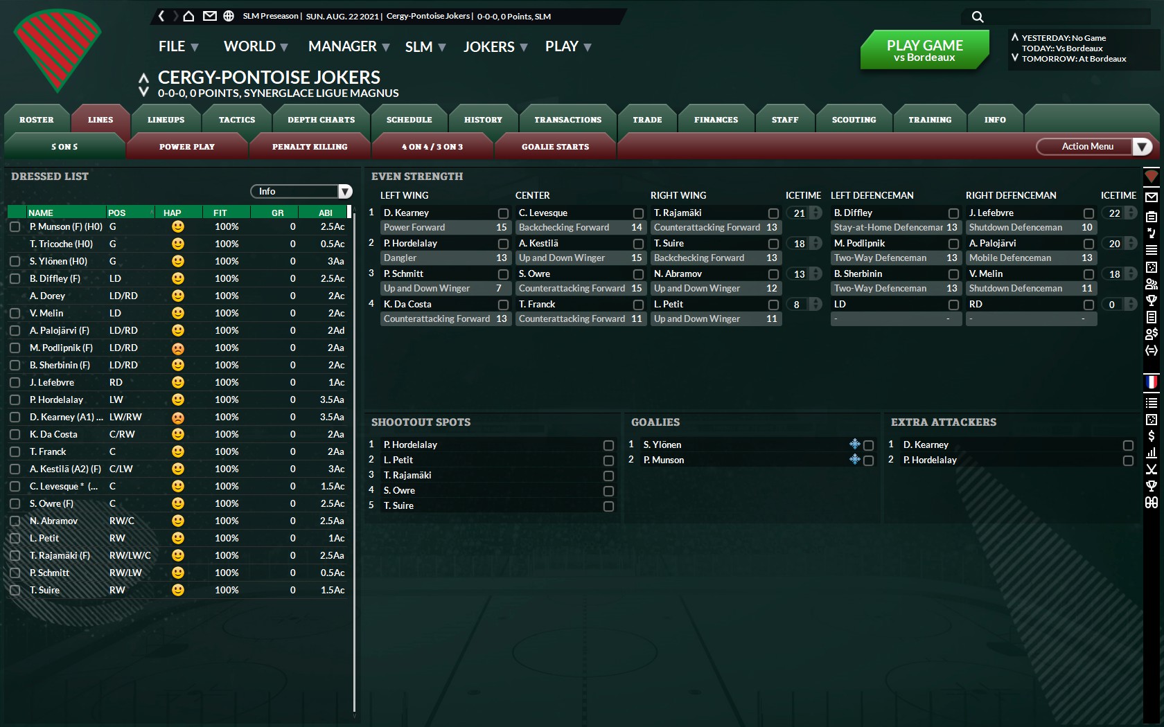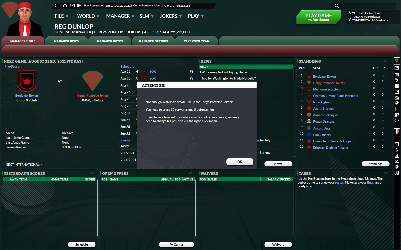 BUT ... now my French team can't play it's first preseason game because I get a popup that says I have to dress 10 forwards and 8 defensemen. It says if I have forwards playing defense or vice-versa (I don't), I should fix it with the right-click menu. And I don't think I can adjust who's dressed, anyway, because I'm playing GM-only. The rules page for Ligue Magnus in the game says 18 skaters are dressed, but I've never heard of 10 and 8. Maybe it means 12 and 8 -- I've seen that in some leagues, especially in preseason. But when I tried to humor the game by signing a player off the U20 squad to be the 8th defenseman, it still wouldn't launch the game. Same popup. |