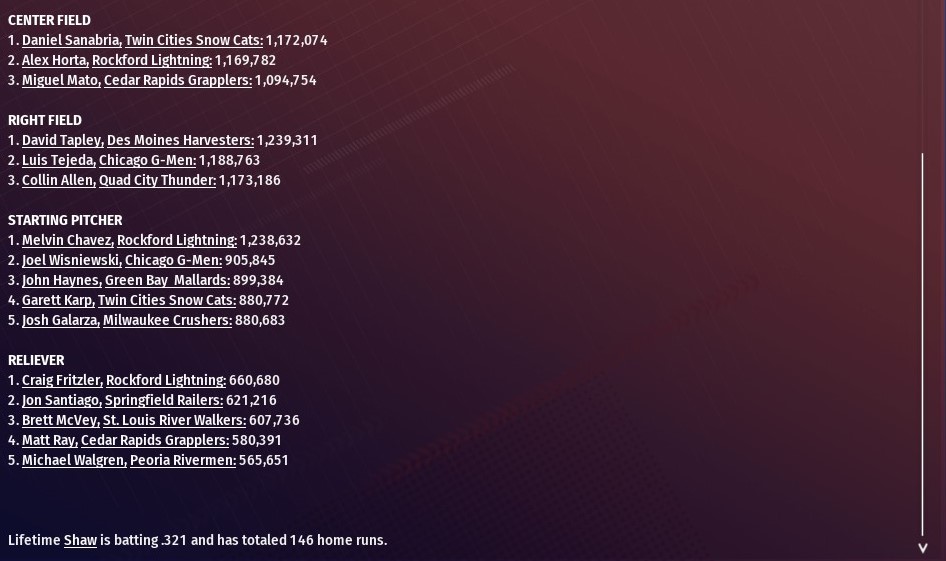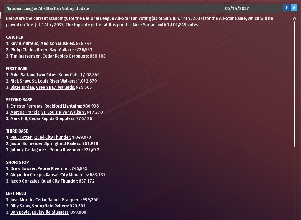 Former River Walker pitcher Jim Martin shut out St. Louis over 8.1 innings and the Madison bullpen finished the job, as the Muskies won 7-0 at Busch Stadium (2006). Martin (6-2), who spent the 2034 and part the 2035 seasons before being traded to Louisville, allowed four hits (three singles and a double) in his 8.1 innings on the mound. He struck out four and walked two. Martin exited the game after giving up a one-out single to Jackson Miller in the bottom of the ninth. Robert Chacon took over and recorded a pair of fly outs to end it. The Muskies jumped on St. Louis starting pitcher Xavier Wigfall for a run in the first. It came via back-to-back one-out doubles from Brady House and Tyler Hamilton. Madison added two more runs off Wigfall in the fifth. Hamilton and former Walker Dan Hillard plated the runs with RBI singles. Adam Macklin smacked a solo homer off Wigfall in the sixth as the lead reached 4-0. The rest of the damage came against the Walkers bullpen. Brett McVey gave up a run in the eighth. Mark Holland tripled with one out and scored on a Kevin Militello single. Armando Cintron surrendered two runs in the ninth. Holland had an RBI single. Militello plated the game's final run with a double. |