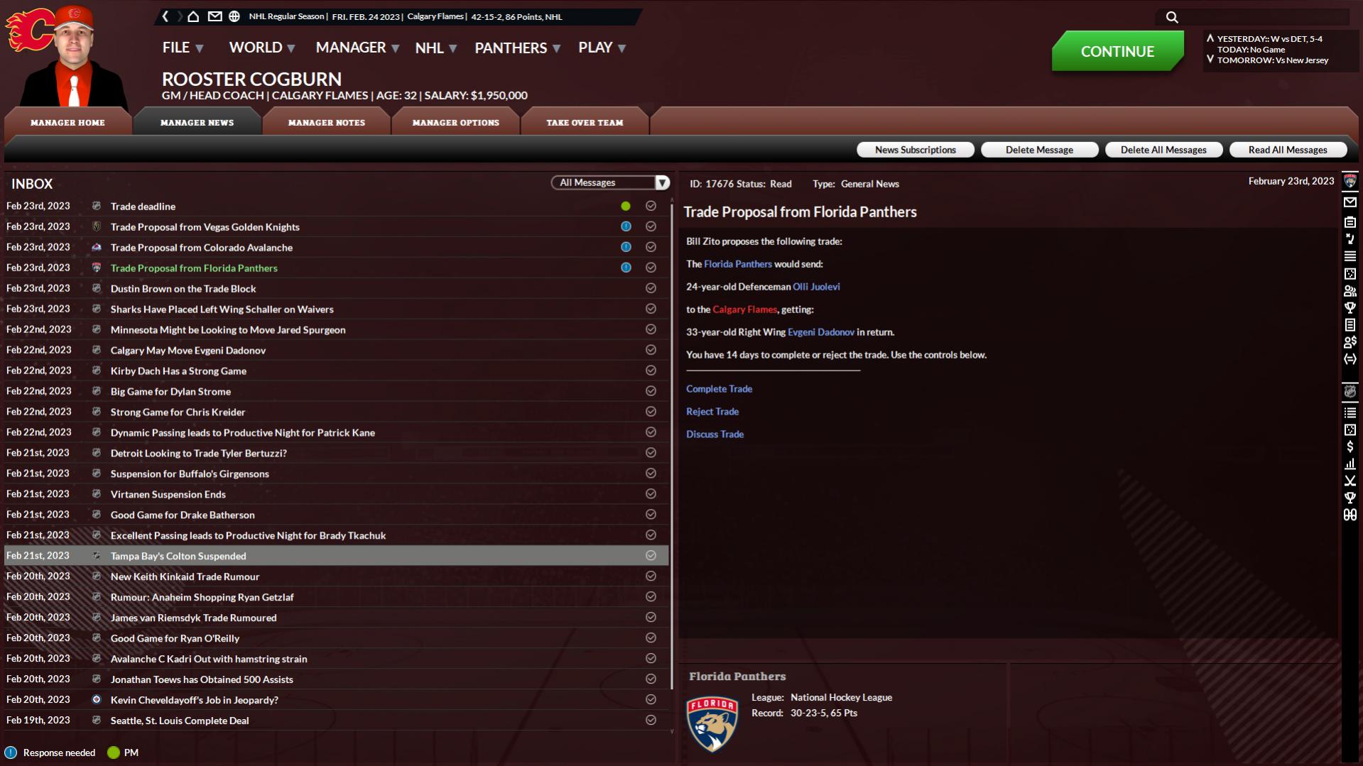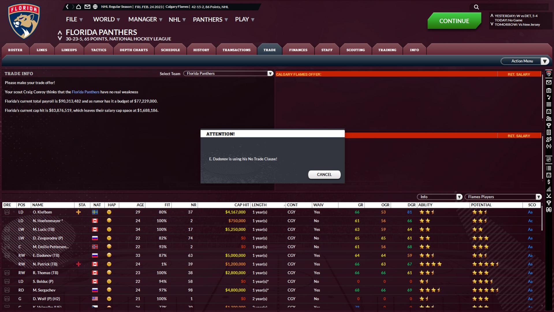 I'm not sure if this is an issue of my understanding of the situation or not but...it's the trade deadline. I've received an offer for Dadonov from the Panthers, it's below what I'd like so I go to do a manual trade with the Panthers and Dadnov uses his NTC to reject being involved, despite being included in the original offer from the Panthers....