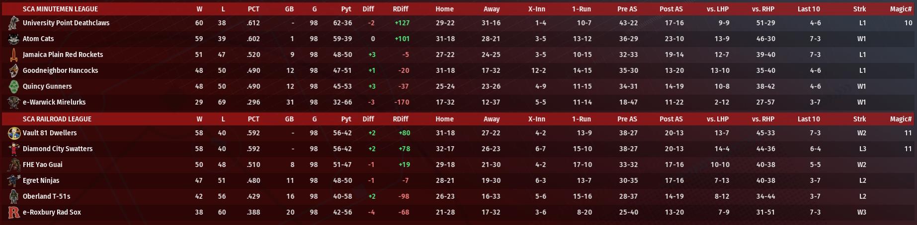 In the tiebreaker games, Starlight defeated Fort Hagen and then County Crossing defeated Starlight for their crooked numbers of games. In the SCA, Diamond City beat Vault 81 for 1st place in the RL. Nordhagen Beach's 12-game win streak to finish the season also earned them the best season ever with their 79-29 record, beating Goodneighbor's record by two games. There were lots of records set, especially in pitching. I will just post that here.