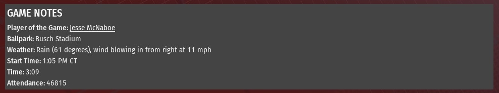 April 16 -- at Indian St. Louis 7, Indianapolis 1 W - K. Hrdlicka (1-0, 0.66 ERA). L - J. Diaz (1-1, 5.25). HRs - StL: N. Shaw 2 (7). April 17 -- at Indianapolis St. Louis 4, Indianapolis 3 S. Rissler (1-0, 1.80). L - R. Canales (0-1, 3.40). Sv - B. Westerman 2, 18.00. HRs - StL: N. Shaw 8, M. Coke 4; Ind: B. Newell 2. April 18 -- at Indianapolis St. Louis 1, Indianapolis 0 W - X. Wigfall (2-0, 3.93 ERA). L - C. Martinez (0-2, 4.05). HR - StL: bin Amr 2. April 19 -- at Indianapolis St. Louis 7, Indianapolis 5, 11 innings W - B. McVey (1-0, 0.00). L - J. Dawson (0-1, 10.80). Sv - N. Ruffalo (1, 1.80). HRs - None. Last edited by rink23; 03-14-2022 at 03:46 AM. |