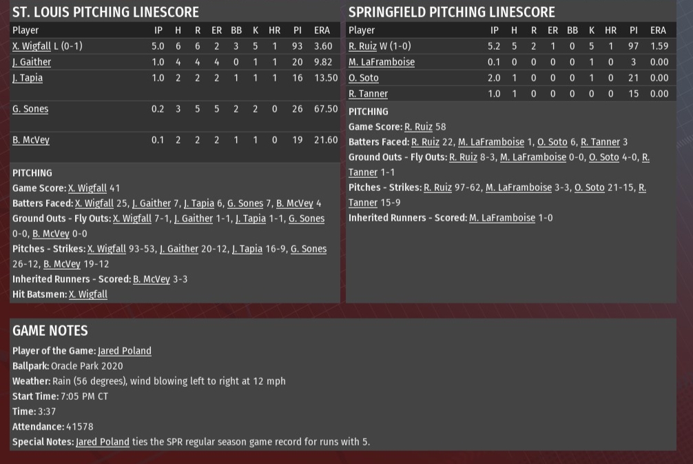 Springfield carved out six runs in the first five innings against St. Louis starting pitcher Xavier Wigfall and then pounded out 13 more against the River Walkers bullpen in a 19-2 rout at Oracle Park (2020). The Railers jumped out to a 2-0 lead in the bottom of the first against Wigfall. They later chased Wigfall with three-runs in the bottom of the fifth to make it 6-1. Ruben Villanueva drove in the final two runs with his first homer of the season. After that, Springfield scored three runs in the sixth thanks to a three-run homer by Joseph Hughes off reliever Jesse Gaither. Two in the seventh, relief pitcher Ozzie Soto driving in both with a homer of Jose Tapia. And seven in the eighth. Hideaki Taguchi had a two-run single off Greg Sones while Jared Poland plated a pair with a single off Brett McVey. Billy Salas capped the outburst with a three-run double off McVey. Springfield starter Ruben Ruiz (1-0) went 5.2 innings, allowing two runs on five hits. He struck out five and didn't walk a batter. Mike LaFramboise wrapped up the sixth inning for the Railers. Soto pitched two innings of scoreless relief. Ryan Tanner handled the ninth inning of lopsided win. |
