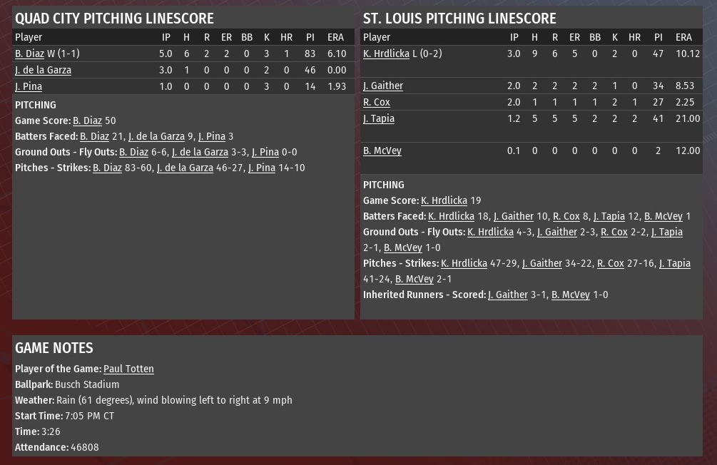 Down 1-0, Quad City raked St. Louis starting pitcher Kevin Hrdlicka for six runs in the top of the fourth inning and kept the onslaught up against the River Walkers bullpen as they ruined their home opener with a 14-2 rout at Busch Stadium (2006). After retiring six of the first seven batters he faced, Hrdlicka seven straight hits to open the top of the fourth -- the seventh hit was followed by a batter reaching on a Hrdlicka error -- as the Thunder turned a 1-0 deficit into a 5-1 lead. Included in that string of its, was a two-run double by Paul Totten, an RBI double by Fontana Felllitti and run-scoring singles by Gabriel Hagan and Joshua Naylor. QC's last run of the inning came when reliever Jesse Gathier issued a bases-loaded walk to Collin Allen. After that, the Thunder scored two runs in the fifth. Joshua Naylor with a two-run, two-out double off Gaither. Collin Allen hit a solo homer off Ron Cox in the sixth to make it 9-2. And Paul Totten highlighted a five-run eighth with a grand slam off Jose Tapia. Felitti took Tapia deep again later in the inning to make it 14-2. Thunder starting pitcher Benito Diaz (1-1) allowed two runs on six hits over the first five innings. He struck out three and didn't issue a walk. Juan de la Garza chewed up three innings of scoreless relief. Jesus Pina struck out the side in the ninth. |