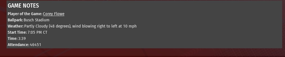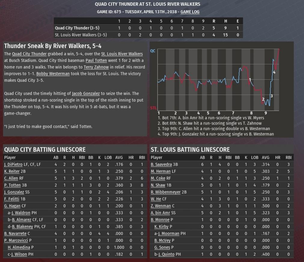 Milwaukee jumped on St. Louis starting pitcher Kevin Hrdlicka for four runs in the top of the first inning and cruised from there for a 6-1 win at Busch Stadium (2006). The victory allowed the Crushers from being swept in the three-game series. The Crushers opened the game with three consecutive singles off Hrdlicka, the third from Nicolas Thibault drove in Lamar Black with the game's first run. After a strike out of Jose Flores, Corey Flowe connected for his first homer of the season -- a 417-foot shot to left center -- to push the gap to 4-0. The River Walkers got their lone run in the bottom of the second on an RBI single from Bob Saavedra off Crushers starting pitcher Justin Buck. Milwaukee added insurance runs in the fourth -- Luke Leto with an RBI single off Hrdlicka -- and sixth -- Jose Flores with a two-out double off reliever Brett McVey -- to cap the scoring. Buck didn't last long enough to earn the win, throwing just 4.2 innings. During that time, he allowed the one run on six hits. He struck out three and didn't walk a batter. The win went to Ed Sutherland (1-0), who finished the fifth inning and worked a scoreless sixth. The seventh and eighth and ninth belonged to Melvin Araujo who earned his first save. Last edited by rink23; 03-20-2022 at 04:31 AM. |