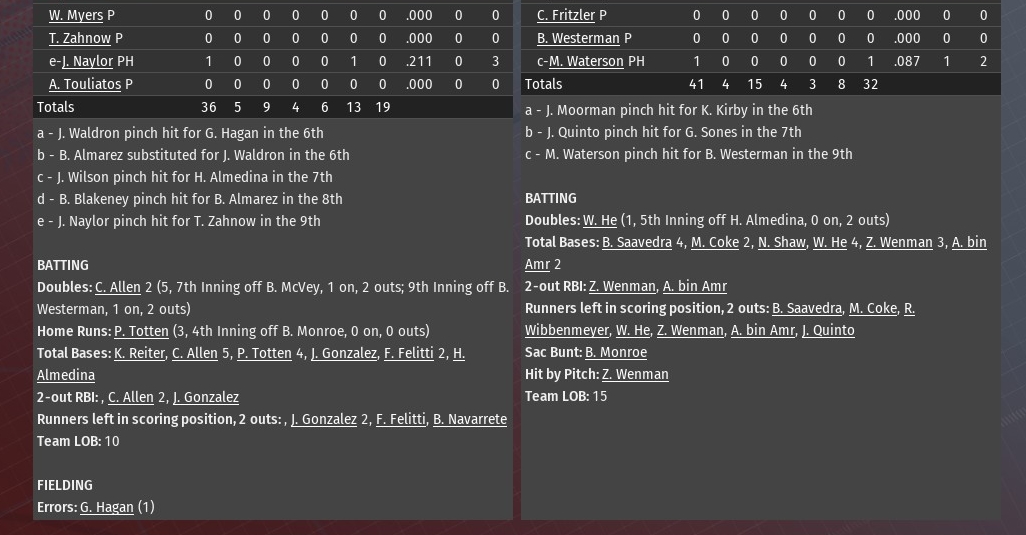 Trailing 4-3, Louisville exploded for five runs in the bottom of the sixth inning to pave the way for an 8-4 win over St. Louis at Dodger Stadium. The win was the second in a row for the Sluggers to complete the three-game series. Joe Bein got things going for Louisville with a lead-off single off St. Louis starter Brad Monroe. The Walkers had acquired Monroe just two days prior in a trade with Peoria. Ryan West hit into a fielder's choice with Bein being forced at second. Sean Nettles then drew a walk. Keith Kirby then replaced Monroe. The left-hander was pitching in a major league game for the first time since last May when he suffered a fractured elbow. His return didn't go well. Bobby Chapman greeted Kirby with an RBI double. After a ground out, Chris Zoltan chased home two more runs with a single. Dan Boyle capped the outburst with a two-run homer. Making his first start for Louisville since being signed in the off-season as a free agent from Twin Cities, Garrett Karp lasted just four innings, allowing four runs on four hits. He didn't strike out a batter and walked one. Jesse McNaboe (1-0), who left St .Louis as a free agent after the 2037 season, picked up the slack with two scoreless innings to earn the win. Manuel Montano lasted just a third of an inning before exiting with a calf injury. Kyle Kulig finished off the seventh and worked a scoreless eighth. Matt Whitmore took care of the ninth in a non-save situation. Last edited by rink23; 03-19-2022 at 04:06 AM. |