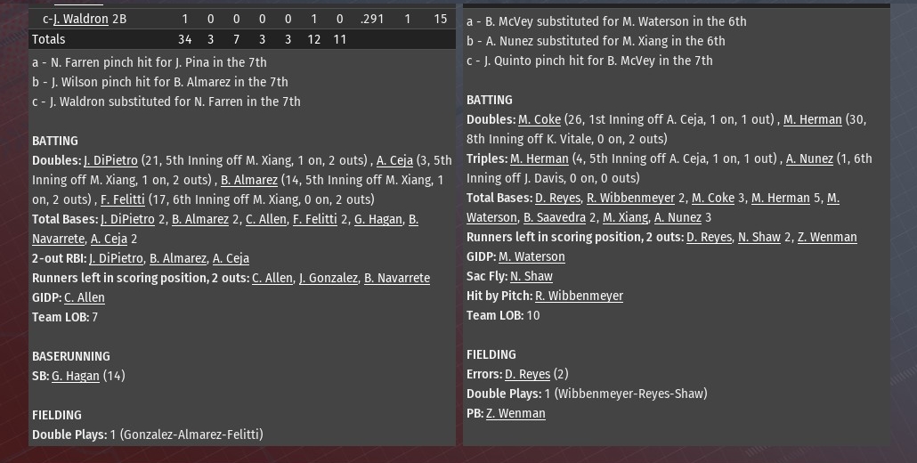 Chicago roared back from an 8-0 deficit to tie it 8-8 after six runs in the top of the eighth inning -- the G-Men later won it after scoring a run in the top of the 10th as they defeated St. Louis 9-8 at Busch Stadium (2006). The win was the second in a row for Chicago to complete the three-game series. The River Walkers cruised through the early portion of the game. Mark Waterson hit a two-run homer in the bottom of the first inning off Chicago starting pitcher Juan Gomez to highlight a three-run inning. The bottom of the fifth was even bigger with a Danny Diaz grand slam highlighting a five-run outburst which pushed the advantage to 8-0. But the G-Men got things going with a pair of runs off River Walkers starting pitcher Brad Monroe in the top of the sixth. Then came the top of the eighth when the Walkers bullpen fell apart. Jesse Gaither allowed the first two batters of the inning to reach bases. That set the stage for a three-run homer from Nate Carey. Kyle Smarr then took over for St. Louis, but the hits continued to come with Alfredo Cano and George Phelps both connecting for singles. Smarr finally did get an out, but it came on an Art McKee sacrifice bunt which moved the runners to second and third. Brett McVey then got the call. He promptly surrendered a double to pinch-hitter Jim Carr, which scored two and make it 8-7. Tony Nolasco was next. He continued the onslaught with a single to tie the game. When the carnage was over, the G-Men had scored six runs on eight hits. Two innings later, it was over, as Walkers closer Craig Fritzler could no keep Chicago from scoring. Ken Turner doubled with one out. He scored two batters later on a Jessie Willoughby double. Gomez lasted four innings, allowing four runs on six hits for the G-Men. He was followed by six relievers -- Devin Eyre, Joel Wisniewski, Keith Kirby, Lenyn Crisp, Nick Wilson and Adam Olmstead -- who all pitched an inning apiece. Wilson (1-0) earned his first win of the season. Olmstead notched his 21st save. |