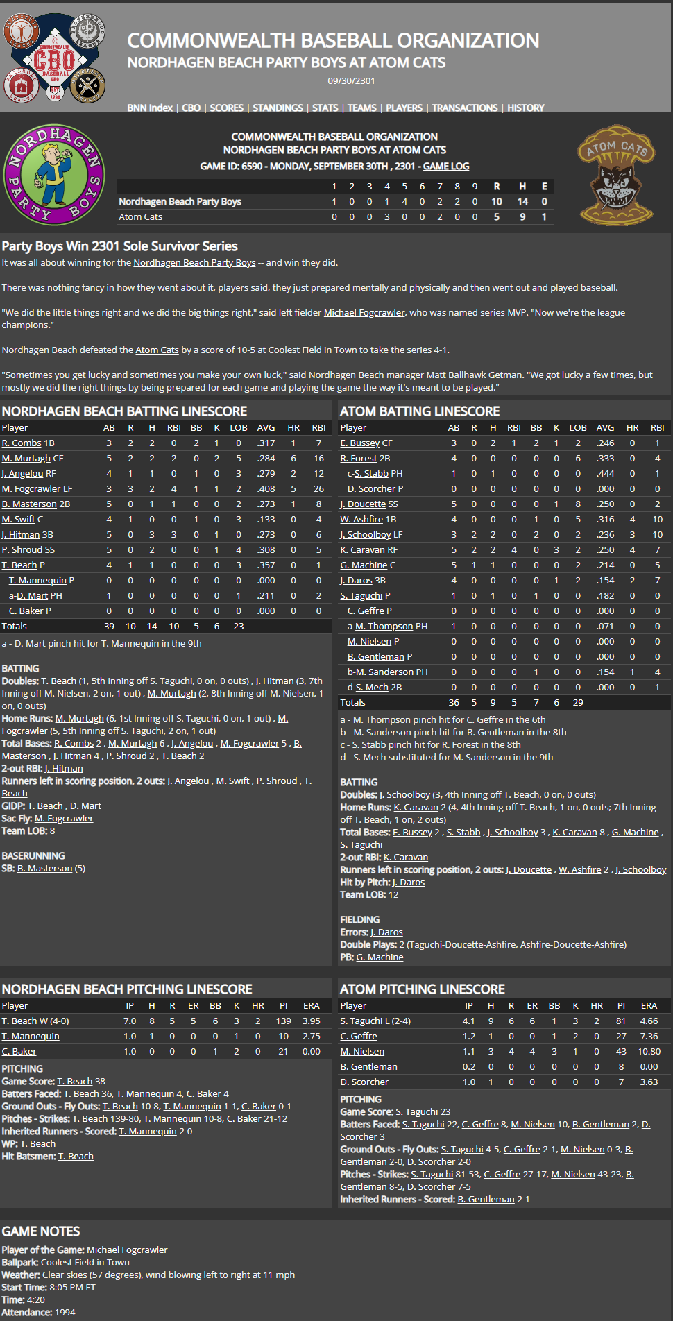 Game 5 - Nordhagen Beach 10, Atom 5 Party Boys Win 2301 Sole Survivor Series It was all about winning for the Nordhagen Beach Party Boys -- and win they did. There was nothing fancy in how they went about it, players said, they just prepared mentally and physically and then went out and played baseball. "We did the little things right and we did the big things right," said left fielder Michael Fogcrawler, who was named series MVP. "Now we're the league champions." Nordhagen Beach defeated the Atom Cats by a score of 10-5 at Coolest Field in Town to take the series 4-1. "Sometimes you get lucky and sometimes you make your own luck," said Nordhagen Beach manager Matt Ballhawk Getman. "We got lucky a few times, but mostly we did the right things by being prepared for each game and playing the game the way it's meant to be played." Analysis Not only was Game 5 not the pitchers' duel we expected, it was downright offensive. Each team scored their series high in the game, with the new champions, the Nordhagen Beach Party Boys, doubling up the scrappy Atom Cats. Tommy Beach got the win despite allowing five earned runs on eight hits with six walks and three strikeouts in 7.0 innings. Scruffy Taguchi lost both of his starts in the Sole Survivor Series, giving up six earned runs on nine hits with a walk and three strikeouts in just 4.1 innings pitched. Four relievers finished the game, with Mat Nielsen allowing four more runs on three hits with three walks and a strikeout. The Party Boys started the scoring in the top of the 1st when Maxx Murtagh went deep off Taguchi. The Boys added another run in the 4th after Fogcrawler walked, Brian Masterson singled, and Jon Hitman hit a two-out RBI single for the 2-0 lead. Atom answered in the bottom of the 4th, taking their first (and only) lead of the game. Jeremy Schoolboy led off with a double, followed by a two-run home run by Kareem Caravan to tie the score, 2-2. Garrett Machine then singled and then advanced to second on a fielder's choice. After Taguchi singled, Earthbound Bussey singled in Machine for the 3-2 lead. That Cats lead was short-lived, though, once Nordhagen Beach came up in the top of the 5th. Beach got into the pitcher hitting action, leading off with a double. Ryan Combs then singled to put runners at first and third with no one out. Murtagh then hit an RBI groundout to tie the game, 3-3. With one out and two on, the MVP, Fogcrawler, hit a three-run bomb to make it 6-3 and chase Taguchi in favor of Copper Geffre. The Boys added on to their lead in the top of the 7th. Fogcrawler led off with a single. With one out, Mike Swift walked, and then Jon Hitman hit a two-RBI double to push the lead to 8-3. Atom put the game back in reach in the bottom of the 7th. After Beach reited the first two batters, he then walked Schoolboy. Caravan then hit his second homer of the game, making the score 8-5. Despite the Cats' efforts, the Boys made sure there would be no comeback on this day. Combs walked to start the 8th inning and then advanced to third on Murtagh's double. Nielsen intentionally walked Angelou to load the bases, and then Fogcrawler hit an RBI sacrifice fly for the 9-5 lead, chasing Nielsen in favor of Boss Gentleman. Masterson then ended the game's scoring by hitting into an RBI ground out to score Murtagh. The Cats threatened again in the bottom of the 8th, loading the bases with just one out. However, reliever Tom Mannequin was able to escape after he came in relief for Beach. He got a 1-2 fielder's choice with the bases loaded, and then got Will Ashfire to fly out to end the threat. While some players had outstanding games--Caravan (2 for 5, 2 HR, 2 R, 4 RBI), Hitman (3 for 5, 2B, 3 RBI), and Murtagh (2 for 5, 2B, HR, 2 R, 2 RBI)--Fogcrawler was named the game MVP to go along with his series MVP. Fogcrawler was 2 for 3 with a home run, a walk, a sac fly, three runs scored, and four RBI. In the series, he finished 9 for 17 (.529) with a double, a home run, three walks, four runs, and eight RBI. More impressive was that Fogcrawler accomplished a first in CBO playoffs history: the Triple Crown of series MVP. Fogcrawler was the MVP in the Association Semifinals over Fort Hagen, the Association Championship over County Crossing, and the Sole Survivor Series over Atom. In 13 games, he was 24 for 54 (.444) with five doubles, three home runs, six walks, 12 runs, and 19 RBI. He had an OBP of .492 and a SLG of .704 with a 1.1 WAR. Final Playoff Tree Championship Banner