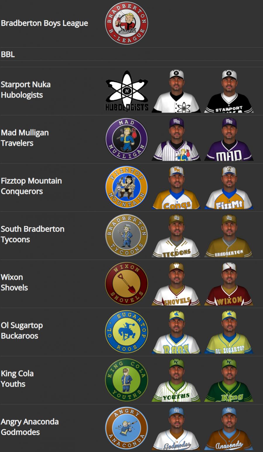 Season Pass Association Name Changes and Uniforms Leagues are as follows: Amusement Park League - AAA Dry Rock Gulch Convicts Galactic Zone G-Force Nuka Bottling Plant Pack Kiddie Kingdom Cappies Nuka Town Operators Safari Adventure Gazelles Grandchester Flying Ants Bradberton Disciples Braderton Boys League - Youth Ol' Sugartop Buckaroos Starport Nuka Hubologists South Bradberton Tycoons King Cola Youths Fizztop Mountain Conquerors Angry Anaconda Godmodes Wixon Shovels Mad Mulligan Travelers Mount Desert Island League - AAA Eagle's Cove Harpooners Oceanarium Oceanics Longfellow Pips Haddock Cove Engineers Fringe Cove Champions Nucleus Radchickens Southwest Harbor Rippers Cliff's Edge Actors Huntress Island Ug-Qualtoths Glowing Grove Brainiacs