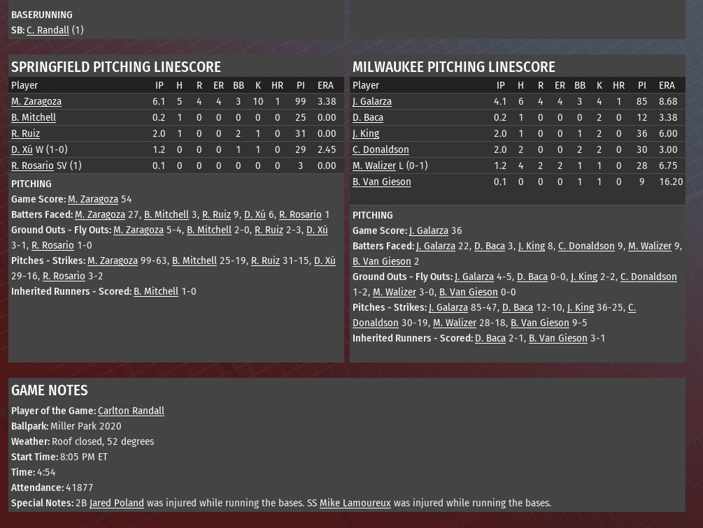 MBL news: Oct. 12 -- NLCS statistics - Springfield defeats Milwaukee 4-1
