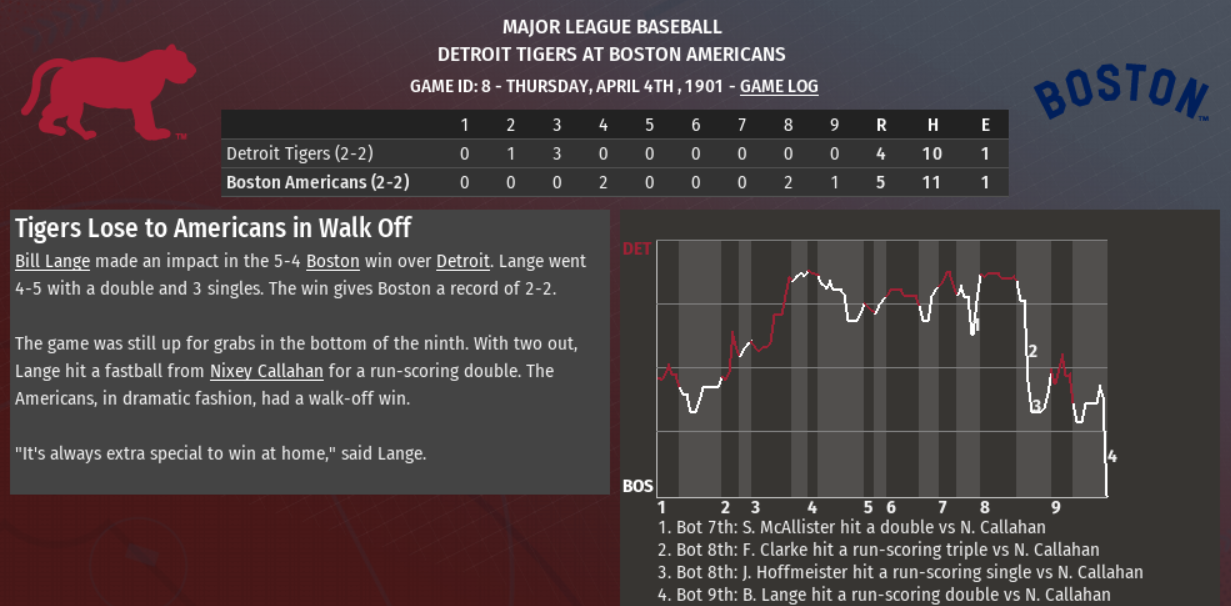 It's Opening Day and the Detroit Tigers squared off against the Boston Americans. The home fans were treated to a 4 to 2 win, with Noodles Hahn getting the complete game victory. The hype surrounding the matchup of top pitching prospects Doc White and Noodles Hahn was at max level, and the two pitchers did not disappoint. While White's (0-1) control was shaky (7 walks), he flashed moments of dominance. Not to be out done through was Hahn (1-0), who went the distance, allowing just 1 ER, 3 hits, and striking out 5, to get the win. Win Mercer led the way at the plate for the Americans, going 2 for 3 (Double) with 2 Runs and a Walk.