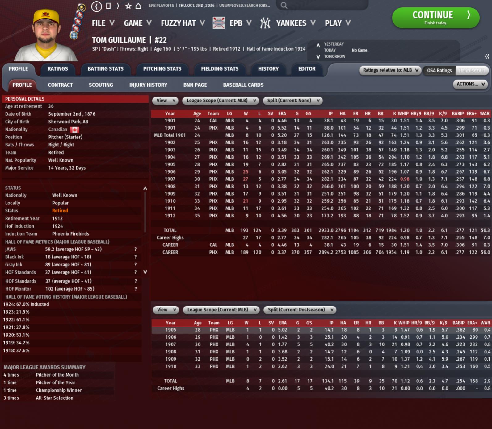 Dave Douglas had a lengthy career even with most of his 20s coming in the pre-MLB era. The 6’0’’ 180 pounder from Dallas, Oregon was a right-handed bat who apart from a brief stint at third base and left field at the very end, played his entire career at shortstop. “Scuba” surprisingly only won the Gold Glove once despite a career Zone Rating of 136.8 over 1781 games at short. Five times he was named the best hitter at the position. By the time Major League Baseball was officially formed for the 1901 season, Douglas was already 27 years old. But he was well known as a very solid all-around hitter, fielder, and leader. As such, Cincinnati used their first pick in the inaugural draft to choose Douglas; 24th overall. Douglas played eight seasons with the Reds, leading the National Association in WAR in 1901, 1902, and 1905 as well as in runs in 1905. In 1908, Cincinnati had their first-ever playoff berth, falling in the NACS to St. Louis. That would be his last season as a Red as like many others, he chased the big money and allure of the Houston Hornets dynasty. He signed a four year, $15,520 deal at age 35 and played four years with the Hornets. Douglas would be an integral starter for Houston as they won three straight World Series titles from 1910-1912. Douglas led the American Association with 139 runs in 1910 and 1911, posted a 10.1 WAR for his lone MVP season. During the three-peat, he had 57 playoff hits and 32 runs scored. After 1912, now age 39, his contract was purchased by the Leon Lions of CABA, which was something allowed in the early days between the two organizations. He was respectable in his year there, but age caught up as he was traded to Haiti in 1914. He made a brief return in 1915 and 1916 to the majors with Atlanta and Las Vegas, but by this point, his days as a premier player was done. For his MLB career, Douglas finished with 91.4 WAR, 2249 hits and 1392 runs scored with a .286 average and .374 OBP. An always solid defensive presence, reliable hitter, and team leader, Douglas earned his spot among the HOF greats. Tom “Dash” Guillaume – Starting Pitcher – Phoenix Firebirds – 67.0% (7th Ballot) The first Canadian inducted into the MLB Hall of Fame, Tom Guillaume in rural Alberta. As he got older, the 5’7’’ 195 pound righty was introduced to baseball by some friends. A “fan favorite” personality type, Tom’s work ethic and adaptability made him a quick study despite not being exposed to the game much as a kid. He was never a dominant pitcher, although his fastball did top out in the 96-98 range. But his stuff and movement were always respectable, his control solid, and his repertoire diverse, switching between a fastball, slider, changeup, splitter, and forkball. Guillaume was 24-years old when the MLB was officially formed and was well enough liked and known locally in Alberta to get on the radar of the Calgary Cheetahs. In the inaugural draft, he was picked in the 10th round by Calgary; the 463rd player overall. In his few months with the Cheetahs, he pitched an unremarkable 38.1 innings. In July of 1901, he was involved in a trade with Phoenix, sending a farm boy from rural Alberta to the heat of Arizona. The Firebirds put him in as a starter, but he finished his rookie year with a lousy 5.20 ERA, not exactly a guy seemingly destined for greatness. The remaining 11 years of his MLB career would be with the Firebirds. He gradually worked on his craft, eventually making his way into an ace role for a team that made the playoffs each year from 1905 to 1910 after struggling in their first years. Tom led the American Association in wins in 1906, 1907, and 1910, while leading in WHIP in 1907. That 1907 season was his lone Pitcher of the Year, going 27-5 with a 2.77 ERA over 282.1 innings, 42 walks, 224 strikeouts, and a 0.98 WHIP. In five postseason starts, he posted a 4-1 record, 1.77 ERA over 40.2 innings, helping lead Phoenix to their first World Series title. It would be the team’s only Association title in the run, suffering four knockouts in the AACS despite strong win-loss records. Guillaume was a solid playoff performer though, with a career 2.61 ERA in 17 playoff starts with 134.1 innings. 1911 was the end of Phoenix’s run at the top of the Western League and Tom saw a step drop-off in personal production in 1912 at age 35, retiring after that season. Guillaume finished with a 193-124 record, 3.39 ERA over 2933 innings with 1984 strikeouts and a 56.3 WAR. He was rarely dominant, but a well-liked teammate and reliable starter with a few years atop the staff during a strong run for Phoenix. The lack of flash meant it took him seven tries on the Hall of Fame ballot to narrowly make the cut, but Guillaume found his spot in the Hall of Fame. Baptiste “Matchbox” Timothee - Starting Pitcher – Havana Hurricanes – First Ballot (77.9%) The first Central American Baseball Association Hall of Famer, Baptiste Timothee was the first great starting pitcher in the Caribbean League. Born in rural northern Haiti, the hard working Timothee was inducted to the game in his mid 20s and took to it. He had four pitches with a mid 90s fastball, strong slider and forkball, as well as a changeup. “Matchbox” was a right-handed arm, standing at 6’0’’, 200 pounds. When CABA was officially formed, Timothee was already 28-years old, but his past barnstorming earned him a contract with the Havana Hurricanes. In the first year of CABA, Timothee was the Pitcher of the Year with a league-leading 11.9 WAR, a 23-6 record, 1.59 ERA, and 350 strikeouts. He had three great postseason starts to help the Hurricanes to the first Caribbean league title. The next year, Havana would take the CABA title as well. In 1912, Timothee had the second ever CABA perfect game, striking out 15 against Santo Domingo. Timothee would again be Pitcher of the Year in 1913 and 1915, leading the Caribbean League in wins and ERA in both. His 1913 season was a 12.8 WAR season