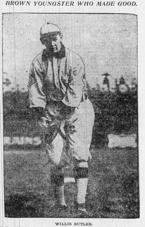 The image on the left is from the St. Louis Globe Democrat, June 13, 1907, and the image on the right (showing Butler in profile) is from the St. Louis Post Dispatch, February 17, 1907. Butler appeared in 20 games for the Browns in 1907, his only major league season. |