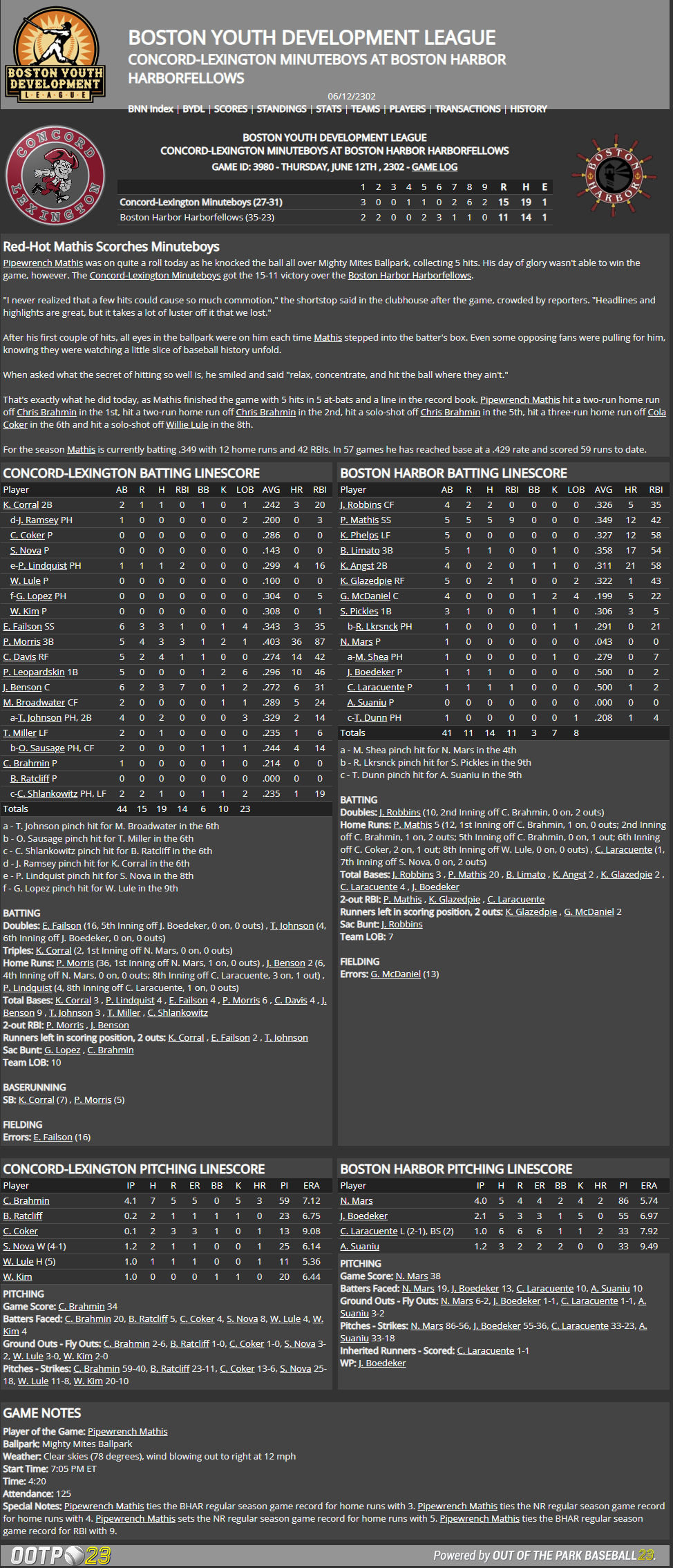 BNN Weekly Report This Week in the CBO, BMU, and GBRL by Nat Wright-Kawolski 9 June 2302 Week's Results Players of the Week NCA - CF Ben Pawlak, Fort Hagen, 8/19 (.421), 3 HR, 9 RBI SCA - 2B Jim Synthseeker, Diamond City, 9/18 (.500), 2 HR, 7 RBI Daily Top Players 6/3 - RF Chris Treestump, Salem, 3/3, 2 HR, 3 RBI, 2 R, 2 BB 6/4 - RF Matt Basile, Finch Farm, 3/5, 2 HR, 6 RBI, 3 R, BB 6/6 - CF Ben Pawlak, Fort Hagen, 2/5, 2 HR, 6 RBI, 2 R 6/7 - CF Earthbound Bussey, Atom, 2/3, HR, RBI, 4 R, 2 BB 6/8 - 1B Oren Gep, Diamond City, 2/3, 2 HR, 4 RBI, 3 R, 2 BB Transactions Monday, June 9th , 2302 Vault 81 Dwellers: Activated RP Andy Nuclear from the injured list. Vault 81 Dwellers: Sent RP Andy Nuclear to Triple A Vault 95 for injury rehab. Vault 81 Dwellers: Released RP Josh Maney. Goodneighbor Hancocks: Activated RP Tiny Greene from the injured list. Warwick Mirelurks: Activated CF Ginger Rogers from the injured list. The University Point Deathclaws traded 28-year old minor league RHP Mike Coombaya, 35-year old minor league LHP Joe Penaltybox, and 35-year old minor league 2B Flunk Domino to the Cherry Ghoulrillas, getting 22-year old LF Arthur Blondeale and 23-year old minor league 2B Goff Parlor in return. Sunday, June 8th , 2302 Atom Cats: Placed SP Deedee Martinson on the 60-day injured list. Atom Cats: Signed RP Brady Petropo. Jamaica Plain Red Rockets: Signed 1B Yellowshoe Trinkle. Saturday, June 7th , 2302 Abernathy Adamantium: Activated C Jimjames LaFleur from the injured list. Warwick Mirelurks: Placed SP Quest Dawg on the 7-day injured list, retroactive to 06/06/2302. Fort Hagen Silver Shroud: Released 2B Davis Shotgunhoarder. Fort Hagen Silver Shroud: Released RP Ben Fusioncore. The Jamaica Plain Red Rockets traded 22-year old minor league C Mike Crayola to the The Slog Ghouls, getting 36-year old RHP David Tower in return. Friday, June 6th , 2302 Warwick Mirelurks: Placed RP Jayden Fleming on the 7-day injured list, retroactive to 06/03/2302. Thursday, June 5th , 2302 Jamaica Plain Red Rockets: Signed 1B Querty Siegfried. Wednesday, June 4th , 2302 Finch Farm Four Leafs: Activated RP Jason Niederer from the injured list. FHE Yao Guai: Released 2B Howie Burgess. Fort Hagen Silver Shroud: Signed RP Josh Copley. Fort Hagen Silver Shroud: Signed RP Jeremy Rogers. Fort Hagen Silver Shroud: Signed RP Ox Holland. Fort Hagen Silver Shroud: Released RP Ox Holland. Fort Hagen Silver Shroud: Released RP Jeremy Rogers. Fort Hagen Silver Shroud: Released RP Josh Copley. The University Point Deathclaws traded 23-year old minor league SS Max Standing to the Brooke's Head Behemoths, getting 31-year old RHP Brad Smailes in return. Tuesday, June 3rd , 2302 Starlight Lady Killers: Placed RP John Walden on the 60-day injured list. Walden suffered a major leg injury from a mutant hound attack. Roxbury Rad Sox: Activated SP Whokill Poole from the injured list. Oberland T-51s: Activated 3B Ryan Bale from the injured list. Nordhagen Beach Party Boys: Signed RP Jason Polson. The Nordhagen Beach Party Boys traded 21-year old minor league SS Water Allen, 23-year old minor league 3B Rough Prince, and 24-year old minor league RHP Titanium Thompson to the Acadia Acadians, getting 23-year old SS Roger Coker in return. Standings Team Power Rankings Weekly Team Power Rankings: Here are the current team power rankings for Commonwealth Baseball Organization: Analysis The CBO season has hit 50, and what can we say but that the season is as exciting as ever. There are some races happening around the league, but most of the Top 5 are entrenched and probable to remain in at least the Top 10 for the final 58 games. Here are the Top 5 and how they performed this week. #1 Fort Hagen - They started out with a shaky early week, losing both games at home to Nordhagen Beach (#2). However, the weekend was all theirs, as the Shroud pounded Concord (#17) into submission with the sweep. Fort Hagen now has a seven-game lead in the Institute League over three teams and a one-game lead for supremacy over the Party Boys for the CBO's top record. #2 Nordhagen Beach - The Boys were perfect this week and now they are on a six-game winning streak. In addition to their wins over the Shroud, Nordhagen Bech also won all three games at Salem (#21). Even though they have not been hot before the solid week, the Party Boys still maintain an eight-game lead over two of their Brotherhood League rivals. Not only that, but the Boys from the Beach have now swept Fort Hagen in both series they have played in 2302. #3 Diamond City - Every time Roxbury (#6) tries to take over the Railroad League, the Swatters swat them down. This week, Diamond City used a 4-1 week to maintain their one-game lead in the RL. The Swatters swept Quincy (#16) and then won two of three at Vault 81 (#11) to do it. #4 Atom - Dropping down this week thanks to a 2-3 week, the Cats still hold on to a slim lead over Jamaica Plain (#5) in the Minutemen League. Atom split with the Dwellers and then lost two of three at the Red Rockets to close out their week. Jamaica Plain now trails by one game for both the ML lead and top record in the South Charles Association. #5 Jamaica Plain - As mentioned, the Rockets gained ground on the Atom Cats. Jamaica Plain went 3-2 on the week, to move from a 2-game deficit to just a 1-game deficit. In addition to the win over the Cats, the Rockets also split with Oberland (#23). Announcement: 2303 Moving to 120 With multiple public transportation sites moving into early testing phases, the CBO and Commissioner Nate Howard have announced that the CBO schedule will expand for the second time. This time, each team will start the season on a home or road stand with other teams in their league with teams from the other association for a one-game regular season battle against each team in the opposite association. How will it work? At the beginning of the season, teams from the Brotherhood League will either host or travel to teams from the Minutemen League 