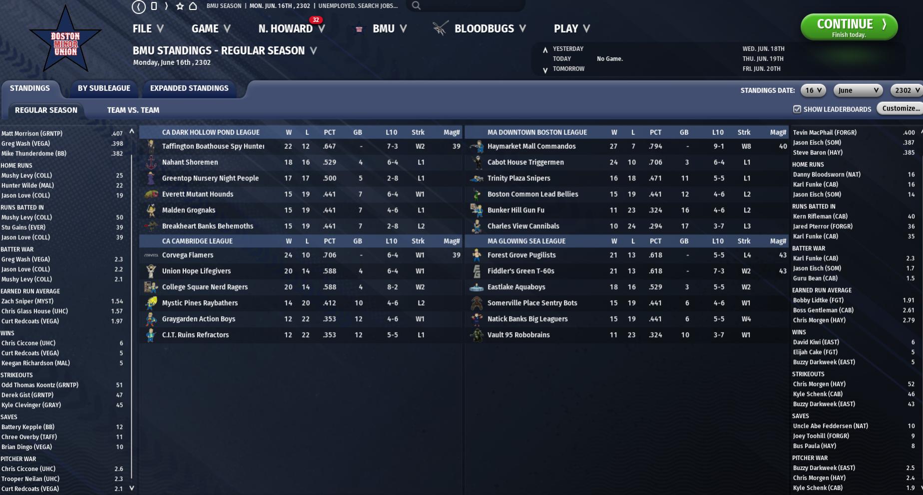 CA Dark Hollow Pond League leader - Taffington Boathouse Spy Hunters (24-18) - 1 game ahead of Nahant Shoremen CA Cambridge League leader - Corvega Flamers (30-12) - 2 games ahead of College Square Nerd Ragers MA Downtown League leader - Haymarket Mall Commanders (33-9) - 2 games ahead of Cabot House Triggermen MA Glowing Sea League leader - Fiddler's Green T-60s (24-18) - 1 game ahead of Forest Grove Pugilists and Eastlake Aquaboys Top Players in June LF Jason Love, College Square CF Karl Funke, Cabot House RP Chris Ciccone, Union Hope SP Brahmin Lover Beardman, Cabot House GBRL NL Northeast Division - Lynn Fortune Finders (32-10) - 6 games ahead of Clifton Vertibirds - Currently on 19-game winning streak NL Northwestern Division - Rocky Narrows Radscorpions (25-17) - 1 game ahead of Sanctuary Hills Zetans SL Southeast Division - Poseidon Energy Mongrels (28-14) - 1 game ahead of Spectacle Island Strength SL Southwest Division - Westing Estate Gunslingers (26-16) - 3 games ahead of Mass Pike Radroaches Top Players in June RF Baktu DaWell, Rocky Narrows CF Stu Gains, Mass Pike SP Hangman Alley, Arlington SP Nate Dorrit, Big John BYDL - Playoff Tree News and Notes 3B Plain Morris, Concord-Lexington Minuteboys, wins Triple Crown in North Region: .395/40/96 SS Stormin Normin MacDonald, Circle Jerks, favorite to win SR MVP SP Flirt Perez, Pleasant Minigunners, and SP Mosie Corncob, Andrew Station Southies, considered leaders for best pitcher awards. CCYL - Playoff Tree News and Notes 1B Frenchie French, Provincetown Land Pirates, and SP Hrye Caje, Wellfleet Settlement Beacons, considered most likely to win best hitter and pitcher awards. PJPL - Playoff Tree News and Notes SP Ogre Olmstead, Freeplat Wicked Goods, most likely to win top pitcher awards. Top hitter up for grabs among CF Hondo Ohnaka (West Seekonk Quahog), 1B Glenn Stackstat (Hope Firestarters), and SS Bobba Fette (Pawtucket Paw Sox).