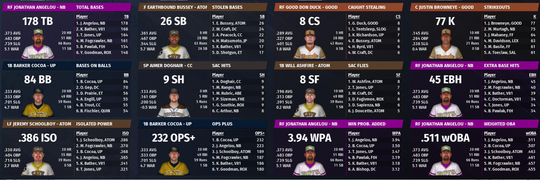 2 June 2302 ---------------------------------------------------------- Nuka News Update Reporting on the NWL, NWLB, and APYL Leagues by Evan Guy Laws of Average Two teams--Victory Cave Crickets (23-13) and Orange Tourists (22-14)--sit atop the NWL standings more than halfway into the 2302 season. The other 6? At best, they are .500 on the season. The two teams at .500--Quantum Nukalurks and Quartz Star Force--appear to be the only teams that could challenge for a playoff spot. Let's take a look at those teams. The Nukalurks were NWL champions just two seasons ago. This season, they are near the bottom in hitting while near the top in pitching, meaning they are in a lot of low-scoring games. They are 7th in runs scored with 171 and 1st in runs allowed with 163. Only two regulars are hitting above .300: 3B T.J. McMath (.339/2/20) and LF Dian Subandrio (.333/2/8). A couple of recent callups are also hitting well, but they do not have enough games to qualify for any awards: 1B Coast Vieira (.357/1/3) and 2B Andy Longface (.405/1/4). Pitching has been their best bet with the 2nd best Starters ERA. All four current starters have good numbers but only one has the wins to show for it. They are: Roger Carlson (3-3, 3.21), David Strickland (4-5, 3.29), Tanner Kern (6-1, 3.61), and Loweland Waterdrop (0-1, 1.20, 8 SV). Waterdrop recently switched with Owen X (4-1, 3.83, 1 SV) for the starter and closer roles. The Star Force were champions three years ago, in the NWL's inaugural season. Like Quantum, Quartz is pitching well but not hitting well, currently 6th in the NWL in runs scored with 174 and 2nd in runs against with 165. Unfortunately for the Star Force, their hitting is not likely to get them anywhere, probably leading them to staying below the three other teams mentioned in this article. The player with their highest batting average, 3B Marmalot Hooch (.296/4/14) was recently sent to the APL's Galactic Zone G-Force. That leaves 1B Corey Ballard (.294/2/12) as the team's leading hitter. The only player with star power, though, is SS Travis Phillips (.284/9/24). 2B Tony Sanchez (.366/5/16) has come on strong, but he has not yet reached the required number of at bats. Despite having the top Starters ERA (3.42) in the NWL, the numbers do not look as amazing for the top two pitchers. SP Bubble Andrews (2-2, 4.18) and SP Tyrese Dyers (3-4, 5.06) are considered the 1-2 pitchers. The 3-4 pitchers are SP Chris Yao (4-1, 3.16) and SP Travis Sisler (3-2, 1.66). For either of these teams to take on Victory or Orange in the second half of the season, the key is for their pitching to remain strong and to see their hitting improve. I have my doubts, though, and I expect the 2302 Nuka Series to come down to the Cave Crickets and Tourists. In other news, this week's player of the week was Dark's LF Crops Gerdenheimer. Gerdenheimer was 9 for 25 with 5 home runs and 15 RBI. On the season, he is batting .236 with 15 homers, 39 RBI, and 21 runs scored. Standings APL and BBL In the Amusement Park League, the Nuka Bottling Plant Pack (Quantum) and the Grandchester Flying Ants (Cherry) are atop the standings, both at 22-14. At the bottom, the Nuka Town Operators (Orange) are currently on a 12-game losing streak, dropping them to 12-24 and 10 games back of both the Pack and Flying Ants. CF Dwight Workman of the Kiddie Kingdom Cappies (Grape) was this week's top player. He hit .421, punched four balls over the fence, scored eight times, and had six runs batted in. In the Bradberton Boys League, the Fizztop Mountain Conquerors only remain atop the league at 18-12. They are up by two games over three teams: South Bradberton Tycoons, Starport Nuka Hubologists, and Wixon Shovels. On a seven-game winning streak, the Ol'Sugartop Buckaroos are also in the mix at 15-15. The best player this week was CF Ody Mandrell of the Buckaroos. He had nine hits on the week for a .391 average, hit four home runs, and drove in nine runs. Vim! View Veracious, Vivacious, Vainglorious Vision of the Vim! Leagues by Vikky Vail Standings Analysis Rayburn Point (27-19) is once again atop the Fog Division while the Dalton Farm Fog Crawlers (32-14) repeat atop yet the Harbor Division. The Patcheyes won their first three of four games in the series with Brooke's Head Lighthouse (22-24) and then lost the next two games at Echo Lake (24-22), who are now three games back of the Patcheyes. Only Eden Meadows (17-29) look to be out of contention for the Fog Division as we enter the All-Star Break. The Fog Crawlers went 5-1 on the week, winning five straight. They started the week with a loss to Grand Hotel (21-25) before taking the next three over the Atoms and then the first two games over Far Harbor (18-28). Dalton Farm still leads second-place Acadia (30-16) by two games. Player of the Week RF Alex Hopp, Acadia, 9/22 (.409), 5 HR, 14 RBI MDIL Report The Southwest Harbor Rippers (Echo Lake) of the Small Bertha Division regained sole possession of first place after the Longfellow Pips (Cranberry Island) had a bad week in the Mount Desert Island League. Longfellow is now in a three-way tie for second place with the Cliff's Edge Actors (Rayburn Point) and the Nucleus Radchickens (Eden Meadows) at 27-24. In the Old Longfellow Division, the Huntress Island Ug-Qualtoths (Dalton Farm) are still atop at 31-20 after a 3-3 week. They now hold a five-game lead over the Eagle's Cove Harpooners (Acadia). 1B Chris Eaton of the Southwest Harbor Rippers (Echo Lake) was the Player of the Week. He was 10 for 18 (.556) with four home runs and 12 RBI. MYL Report In the Mount Desert Island Four, the Beaver Creek Bowlers (15-13) maintain a two-game lead over last place Cliff's Edge (13-15). Both the National Park Rangers and Far Harbor Dockdwellers are one game behind. In the MDIF, SP Heri Earz, Cliff's Edge, was the Player of the Week. He was 2-0 in two starts giving up no earned runs in 14.1 innings pitched. He totaled two walks and seven strikeouts on the week, while all