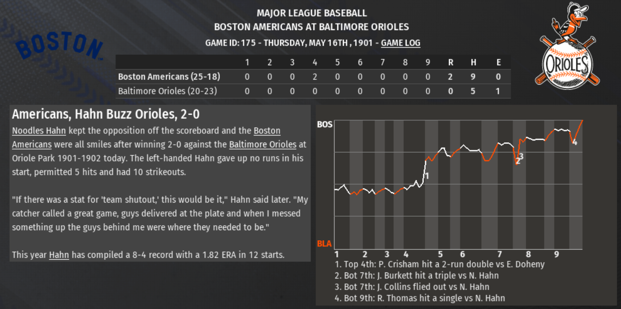 Game 42: The Baltimore Orioles (20-22) ran away with this one, jumping out to a quick lead and cruising to a 7 to 2 victory over the visiting Boston Americans (24-18). Not only did Baltimore pitcher Wiley Piatt (4-5) keep opposing batters in check (allowing just 2 earned runs on 9 hits, while striking out 5 and finishing with a Game Score of 66), he smashed the ball at the plate (2 for 4, 3 RBIs). Taking the loss for the Americans was Cy Young (4-5), who allowed 7 runs (3 earned) on 11 hits (5 extra base) and 1 walk to finish with a Game Score of 40. In addition to Piatt's efforts, the Baltimore hit-attack was helped by Otto Krueger (2 for 4, 2 Runs, 2 RBIs, and 1 Walk) and Roy Thomas (2 for 4, Double). Boston's limited hitting success was provided by Ossee Schreckengost (3 for 4, 1 Run, 1 RBI, Triple) and John Farrell (2 for 4, 1 Run, Double). Player of the Game: Wiley Piatt Game 43: Just what the team needed, a dominate pitching performance by Noodles Hahn to guide Boston (25-18) to a 2 to 0 win over the Orioles (20-23). In picking up the win, Hahn (8-4) tossed a complete game shutout, allowing just 5 hits, 1 walk, and 10 strikeouts to finish with a Game Score of 86. While Ed Doheny (2-3) was tagged with the loss, he pitched very well allowing 2 runs (0 earned) giving up 9 hits and 2 walks and ended with a Game Score of 66. It was the bottom of the Boston lineup that provided the offensive firepower, with the John Farrell (batting 7th, 2 for 4, Double), Pat Crisham (batting 8th, 2 for 4, 2 RBI, Double), and Noodles Hahn (batting 9th, 2 for 3). Player of the Game: Noodles Hahn (Season: #8 / Career: #8) Game 44: After 2 consecutive disappointing outings, the pressure was on Boston pitcher Jesse Tannehill to turn things around. Tannehill (7-4) rose to the occasion, allowing just 1 earned run (Game Score of 68) to lead Boston (26-18) to a 3 to 1 victory over Baltimore (20-24). Ted Lewis (3-6) was saddled with the loss, allowing 3 runs (all earned) on 8 hits and 2 walks (Game Score of 62). Boston centerfielder Bill Lange was the catalyst for the team's offense today, going 2 for 4 with 1 Run, 1 RBI, and Double. Player of the Game: Jesse Tannehill (Season: #8 / Career: #8)