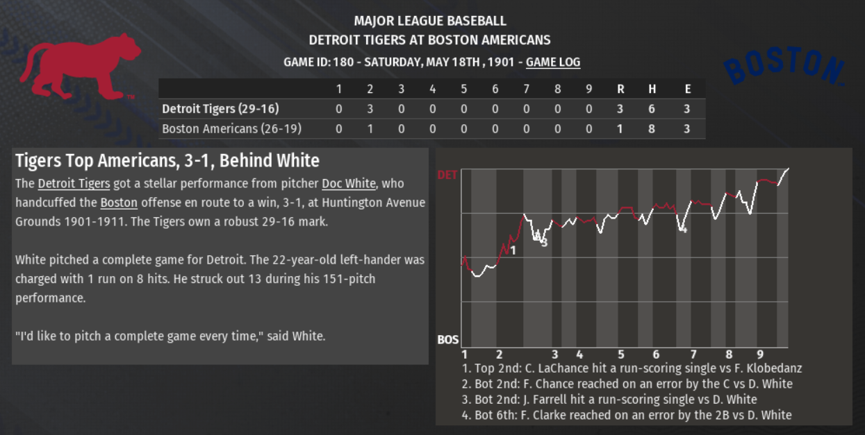 Game 45: What an outing by Tiger ace Doc White! The rookie southpaw was dialed in today, striking out an AL and MLB record 13 batters in leading Detroit (29-16) to a 3 to 1 victory over the Americans (26-19). White (6-6) scattered 8 hits and issued 1 walk, allowing 1 run (0 earned), to finish with a Game Score of 80. Fred Klobedanz (7-4) took the loss, allowing 3 runs (1 earned) while giving up 6 hits and 3 walks for a Game Score of 69. Hobe Ferris (2 for 4) and Roger Bresnahan (2 for 3, 1 RBI) led the Detroit hitting attack, while Boston was led by Fred Clarke (2 for 4, 1 RBI, Double), John Farrell (2 for 4, 1 RBI), and Bill Lange (2 for 4, Triple). Player of the Game: Doc White Game 46: Detroit (30-16) jumped out to an early lead and cruised to a 5 to 1 victory over Boston (26-20). Tigers' pitcher Togie Pittinger (9-3) limited the Americans to just 1 run on 4 hits and 2 walks; Game Score of 75. Boston pitcher Cy Young (4-6) continues to struggle, picking up another loss in which he allowed 5 runs (2 earned) on 5 hits and 4 walks; Game Score of 63. Detroit 1st baseman Candy LaChance had a nice day at the plate, going 2 for 4 (Triple) with 2 Runs and 2 RBIs. Jesse Hoffmeister was the lone bright spot at the plate for Boston, going 2 for 3 (Triple) with 1 RBI and 1 Walk. Player of the Game: Togie Pittinger Game 47: Well any chance Boston had to grab at least one game from Detroit rested on the arm of ace Noodles Hahn. Unfortunately for the hometown fans, the Tigers (31-16) had other plans, topping the Americans (26-21) by a score of 6 to 4. In one of his worst outings of the year, Hahn (8-5) was roughed up for 6 runs (all earned) in which he allowed 11 hits and 1 walk to finish with a Game Score of 42. Tigers pitcher John Malarkey (9-3) limited Boston to 4 runs (1 earned) on 6 hits for a Game Score of 71. Catcher Tom Daly had Hahn's number, smashing out a Double and Triple on his way to a 2 for 4 days (2 Runs and 1 RBI). Win Mercer provided limited offense for the Americans, going 3 for 4 with 3 RBIs. Player of the Game: John Malarkey