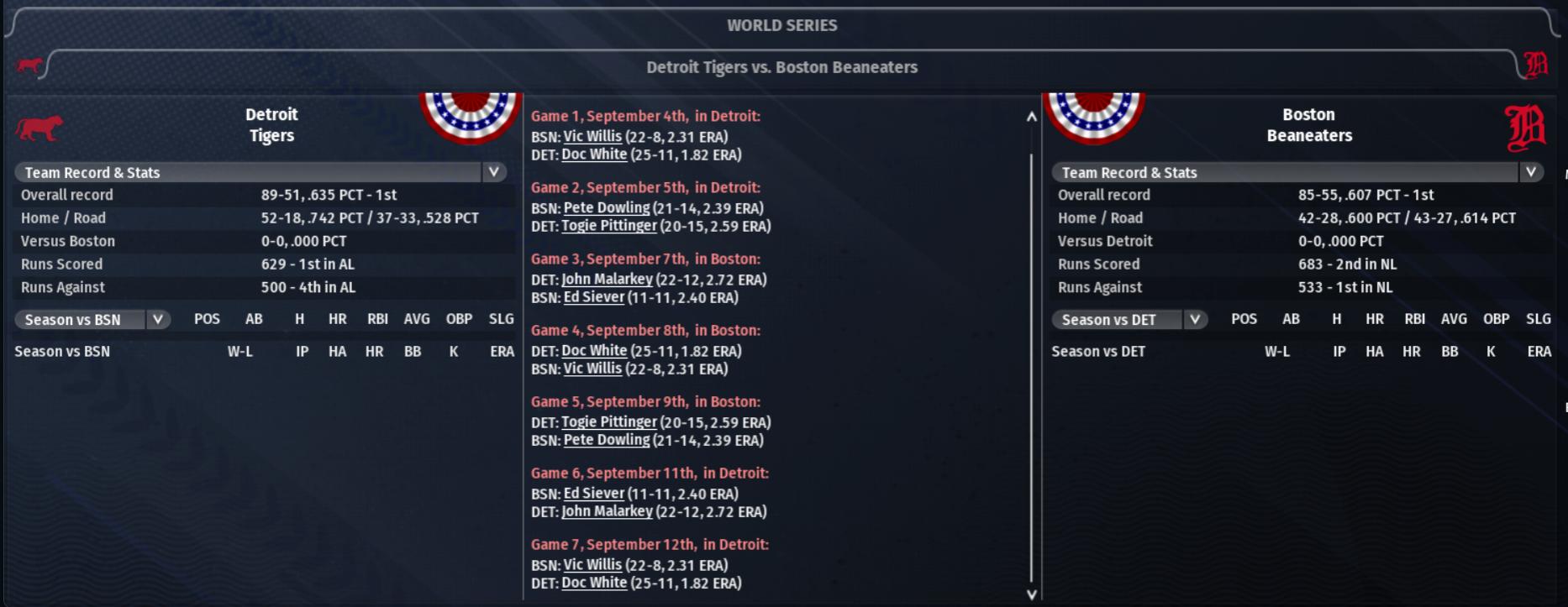 Playoff baseball is here, as the Detroit Tigers (89-51) square off against the Boston Beaneaters (85-55) in the inaugural World Series matchup. Both teams have an overabundance of talent, and this should prove to be an exciting series to watch.