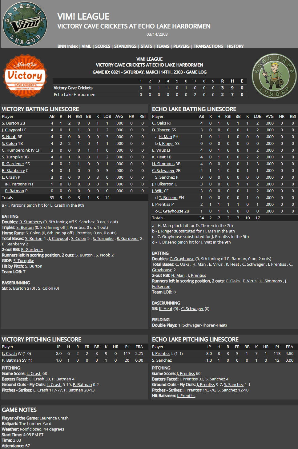 Nuka News Update Reporting on the NWL, NWLB, and APYL Leagues by Evan Guy 15 March 2303 Victory-Echo Lake Rematch Marks Power Play in NWL, VL When the NWL's Victory Cave Crickets and the VL's Echo Lake Harbormen met in the 2303 Season Pass Series, a seven-game series between the two leagues' champions, there was some doubt on how competitive the league from an island in Maine could do versus the powerhouse league of Bradberton and the Nuka-World area. The Harbormen ended that discussion, winning the second Season Pass Series, four games to one. Coming into the 2303 season, then, the NWL had something else to prove. That's where they could showcase the changes and improvements through the preseason's Season Pass Tournament. As it turned out, both Echo Lake and Victory proved to still be the best of the best in the two leagues. On March 14, with the Harbormen one win away, both the Harbormen and Cave Crickets battled for the 2302 championship. As a reference, the runners-up in the 2301 Season Pass Series, the Far Harbor Ghoul Whales of the Vim! League, won the 2302 Season Pass Tournament. That gave Victory hope. Victory then achieved their name in the first matchup, winning 3-2 to force a 35th game and winner-take-all matchup for March 15. In the 3-2 win, one of the Crickets' star pitchers, Laurence Crash, was the hero, allowing two earned runs on six hits with three walks and nine strikeouts in 8.0 innings of work. Patch Batman pitched the ninth for the save. The Crickets were led offensively in Game 34 by 1B Settler Colon. He went 2 for 4 with a home run, two runs scored, and an RBI. His 6th-inning bomb against Echo Lake starter Jesse Prentiss proved to be the winning run, giving the Crickets a 3-0 lead at the time. Prentiss allowed three earned runs on eight hits with a walk and seven strikeouts in 8.0 innings. He was also 1 for 2 with a walk, a run, and an RBI. In Game 35, Echo Lake led the entire time in taking the Season Pass Tournament title, 5-3. The Harbormen's Berg Poppy led the way, pitching 7.0 innings, allowing two earned runs on nine hits with a walk and a strikeout. Victory's John Diner got the loss by allowing three earned runs on seven hits with eight strikeouts in 7.0 innings. The Harbormen's Sheep Sanchez earned the save by allowing one earned run on two hits with three strikeouts in 2.0 innings. Echo Lake started the scoring early on Diner, getting two runs in the top of the 1st inning. RF Chris Oaks led off the game by bunting for a single on the first pitch. After stealing second, Oaks scored on a one-out double by LF Edgar Virus. Virus was then thrown out at home on the next at bat on Keagan Heat's single. However, Heat scored when 3B Hollywood Simmons singled. Two of Victory's three runs came on solo home runs. Their first run came in the bottom of the 5th still trailing 2-0. C Bobby Stanberry hit a home run off Poppy to cut the lead to one. Stanberry finished the game 2 for 3 with a double, a home run, a walk, two runs, and an RBI. The final run came in the bottom of the 9th trailing 5-2 at the time. 2B Shawn Burton, who was 0 for 4 coming into the bat, hit a deep home run with the Cave Crickets down to their final pitch. Burton also added another RBI in the 7th on an RBI groundout that scored Stanberry. The Harbormen had three players with two hits apiece. Virus and Simmons were two of those players. Virus was 2 for 4 with two doubles and two RBI. The NWL regular season begins April 20 when the Quartz Star Force take on the Cherry Ghoulrillas. The Cave Crickets begin the next day when all eight NWL teams play. Victory will take on the Dark Bloodworms on April 21 at Dark's Ol' Sugartop Ballpark at Dry Rock Gulch. The Vim! League's regular season starts on April 5. Echo Lake will travel to Dalton Farm for their first two games before hosting the Fogcrawlers in the next two. Winners from each league will face off for the third time at a yet-to-be-determined date in August.