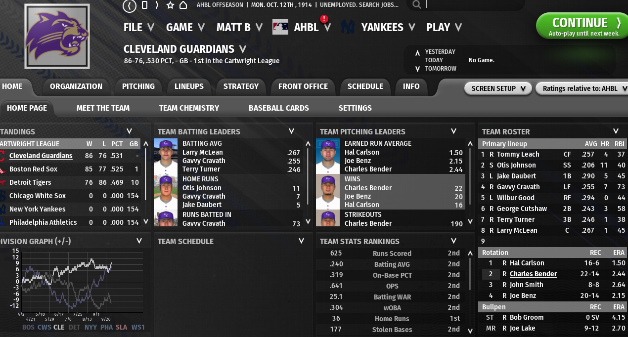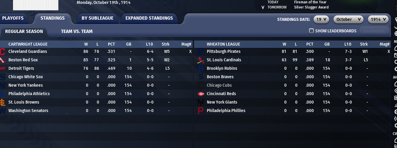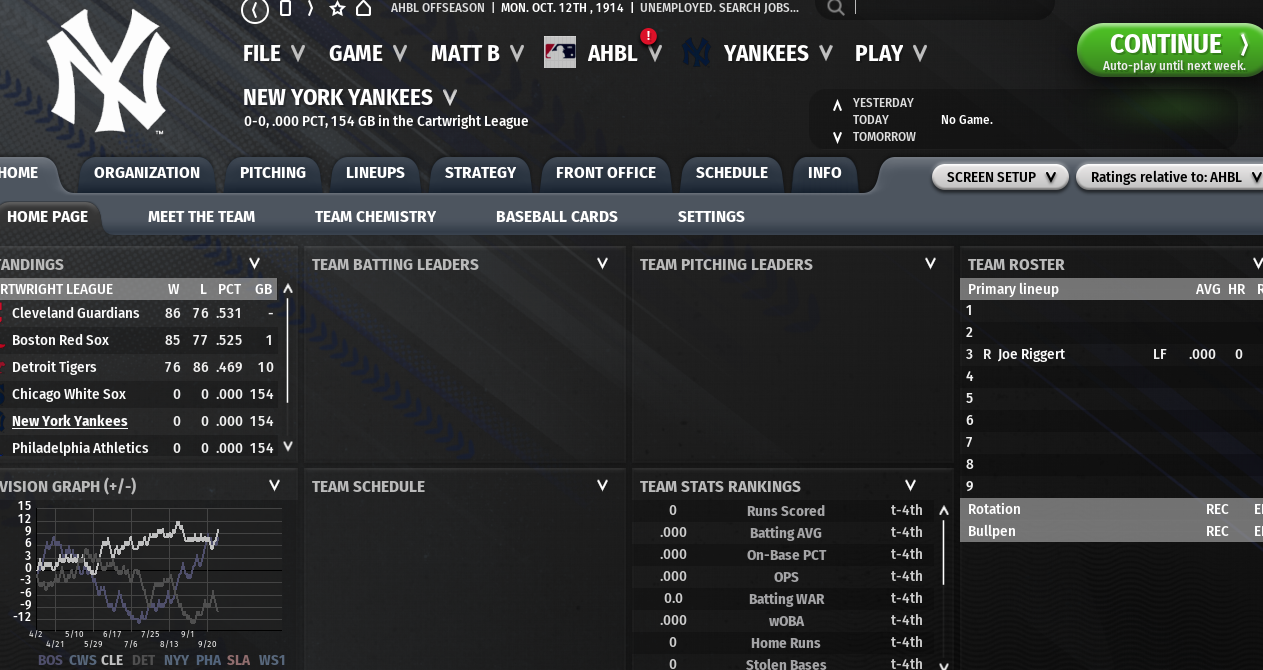 I played the next day but everything is still seriously messed up. Half the league has played games, half are 0-0. Half the rosters are empty and my team names are gone and the MLB team names are back. I'd like to try to salvage it though because the league history up until the day it messed up (day after 1914 world series) is perfect. Last edited by matttb324; 04-22-2023 at 10:10 AM. |