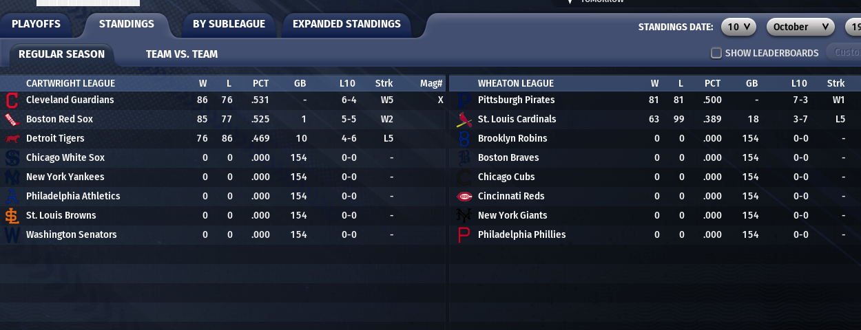 When I got to the next screen all of the team names that I had changed back in 1903 from MLB team names to ficticious names had reverted. Now the MLB team names are back although the league history and everything seems to be the same. Even stranger the standings show half the league playing and half the league not playing. I'll post a couple pictures. Anyone have any idea what could have happened. Thanks so much! ![]()