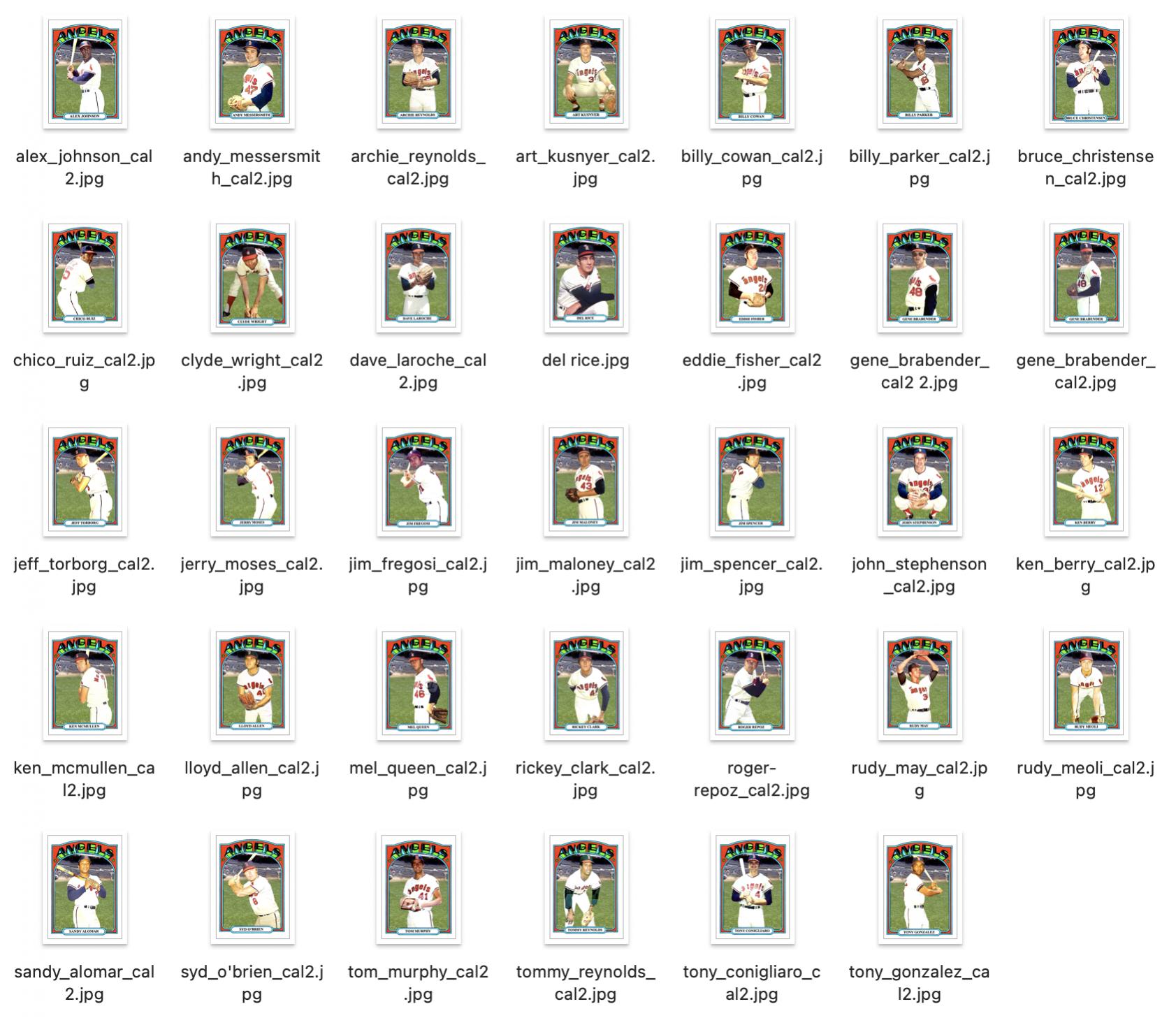 It's been a while since I have posted here. I am currently working on making 1972 cards based on the 1971 season players. Similar to Topps, but without the head shots and airbrushing to place players acquired during off season on cards. I have been searching for any images of Angels' players in the home uniform to match what I have found. I have attached completed cards to show who is already done. I don't mind if images are of players who did not play in 71, but are pictured in seasons' home uniform. (see Gene Brabender) Not sure if I may have missed some of the Topps Vault images that were released and some of you may have them. Any help would greatly appreciated. Message me if you have images, but you may not want to post here. Thank you for any help.