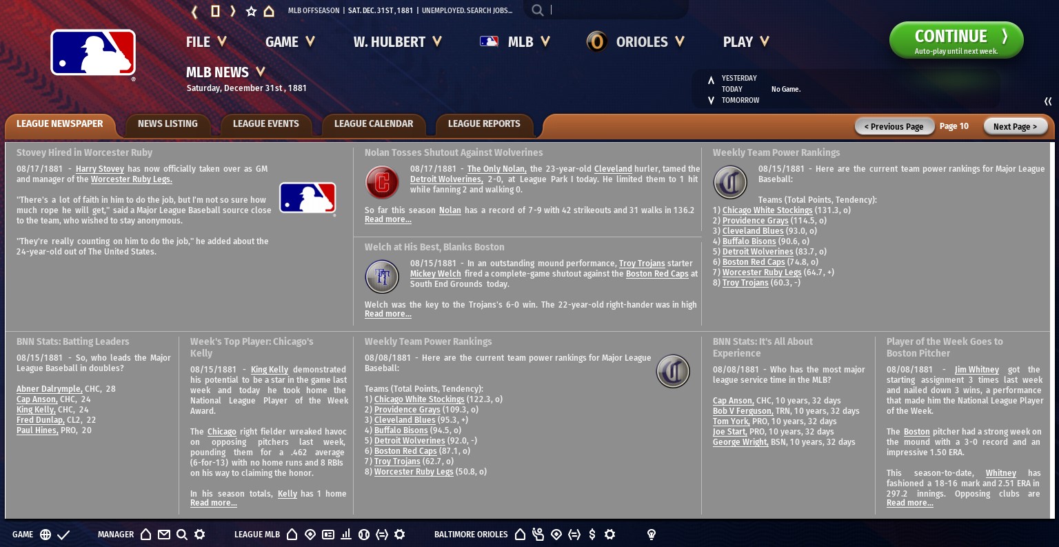 Would like to pose series totals but i dont know of an easy way. I didn't see where the game would let you open it in a browser. Well now its on to 1882 and the debut of the American Association. Simming might take a little longer for the 1882-1892 seasons. From 1893-1900 it might be a little faster. |