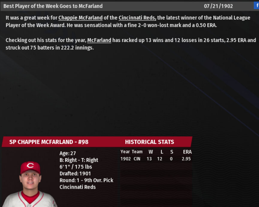 The Cincinnati Reds churned out another National League Player of the Week recipient, this time pitcher Chappie McFarland taking home honors. On the week, McFarland went 2-0 with a 0.50 ERA, 8 Strikeouts, and 2 Walks for 0.6 WAR.