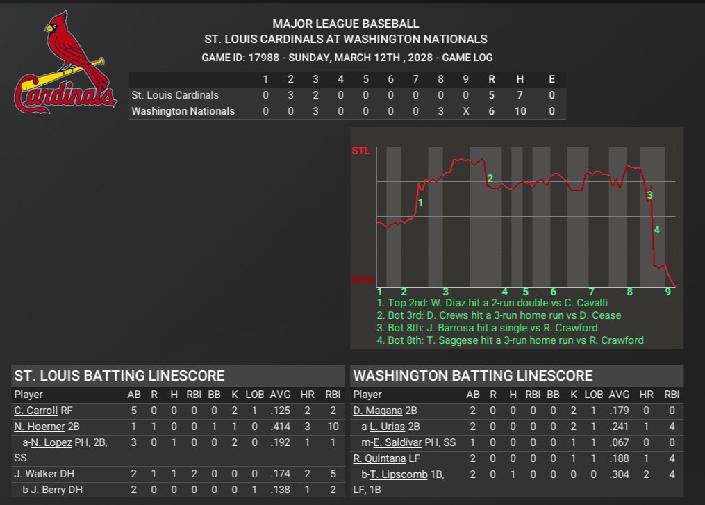 Cards news: March 12 -- Spring Training - Washington Nationals 6, St. Louis Cardinals 5, (7-7-2)