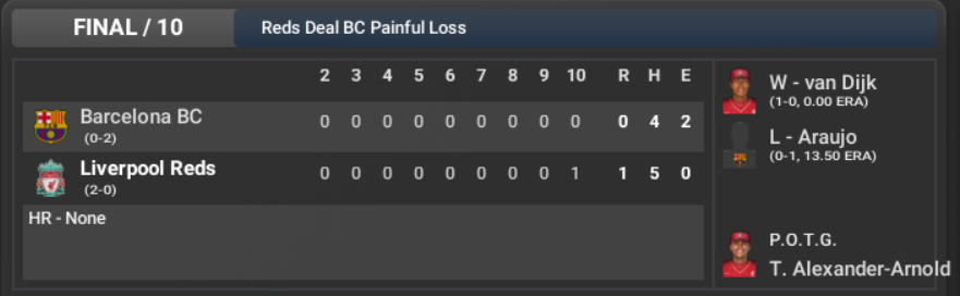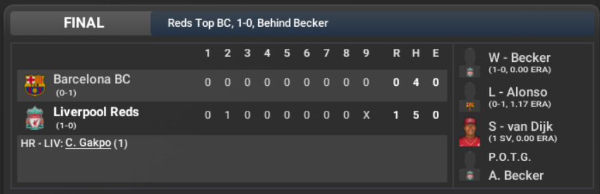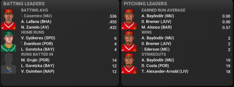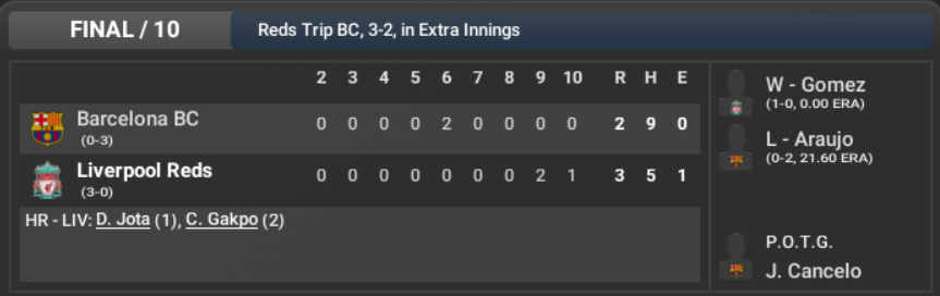 FEATURED SERIES: LIVERPOOL VS BARCELONA An early season battle of two favorites in the Europa League. Game 1: Allison Becker holds Barcelona scoreless over 8 innings, racking up eight strikeouts. Cody Gakpo's solo HR in the 2nd is all the offense Liverpool needs. ![]() Game 2: Liverpool pitching holds Barcelona scoreless for a second straight game. Trent Alexander-Arnold throws 8 scoreless inning with 8 Ks and Van Dijk follows up with two scoreless innings. Szoboszlai wins it with a walkoff double in the bottom of the 10th ![]() Game 3: Barcelona finally gets their first runs of the season in the 6th inning. Joao Cancello throws 8 scoreless with 8 Ks. Araujo comes in for the save but gives up a tying 2 run HR to Diogo Jota. Cody Gakpo hits a walkoff HR off Araujo in the 11th and Liverpool has an opening weekend sweep of Barcelona. ![]() GAME ACHIEVEMENTS ![]() Other Notable • Rick Karsdorp (ROM) starts opening day with a bang, hits for the cycle against AC Milan! • Martin Dubravka (NEW) shutout vs PSG (5 H, 1 BB, 10Ks) • Emerson Royal (TOT) throws shutout against Atletico Madrid (4H, 1BB, 5K) • Giovanni Di Lorenzo (NAP) shutout vs Newcastle (7H, 2BB, 9K) Casemiro (MU) goes 5-5 against GAL, with a HR and 3 RBIs NOTABLE INJURIES